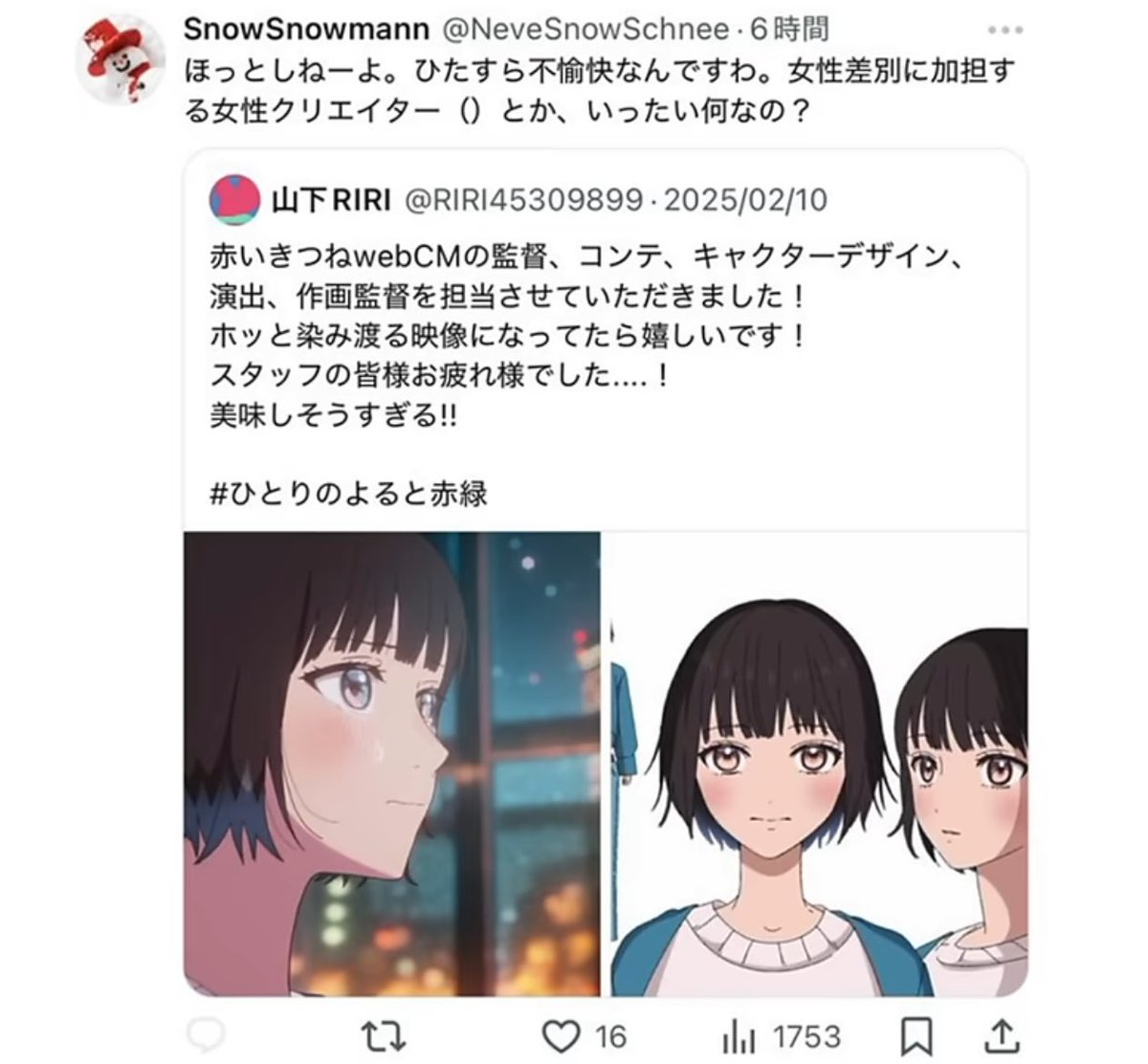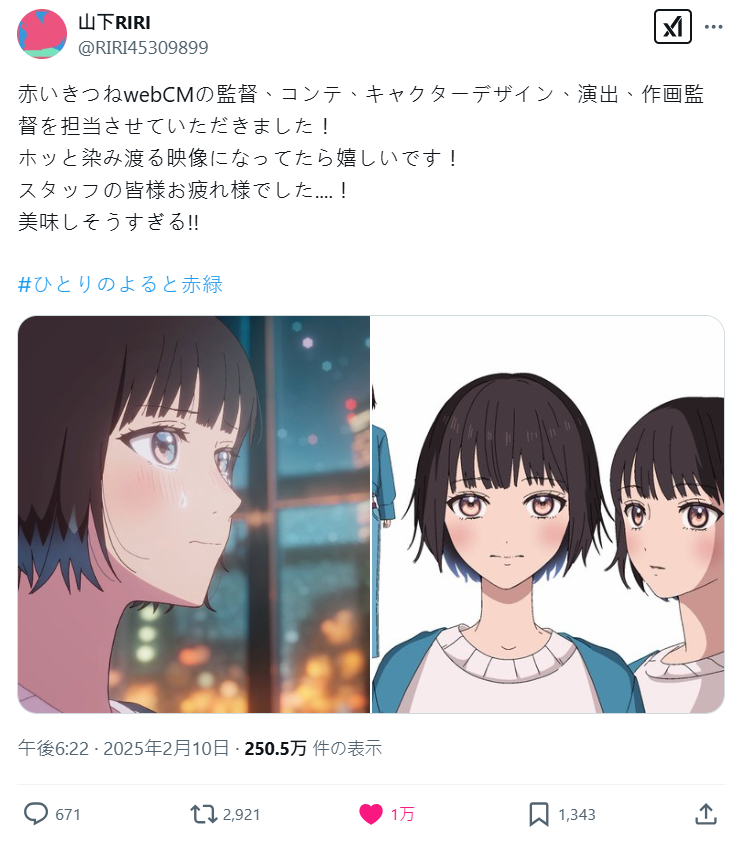 由於製作本次動畫廣告的動畫師山下RIRI,它也表示這次包含導演、演出、人物設計與作畫監督都一併負責,後來這則廣告在網路上引起爭論後,也不少人開始關注到這位動畫師。