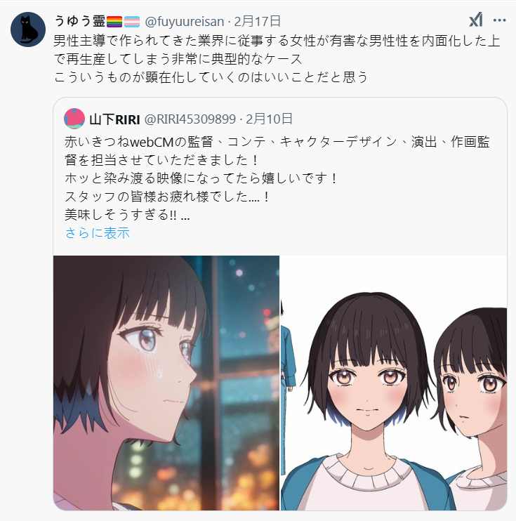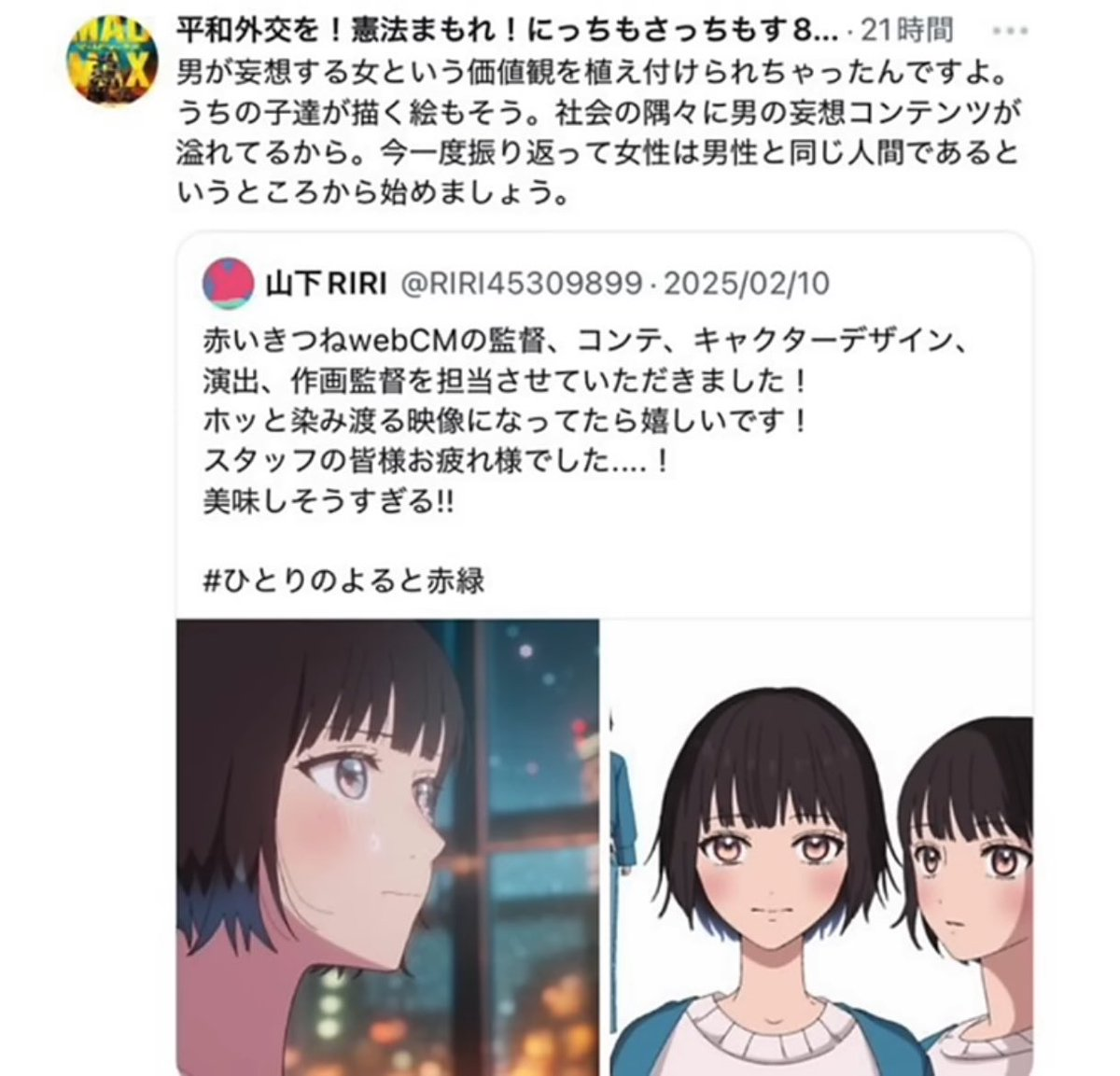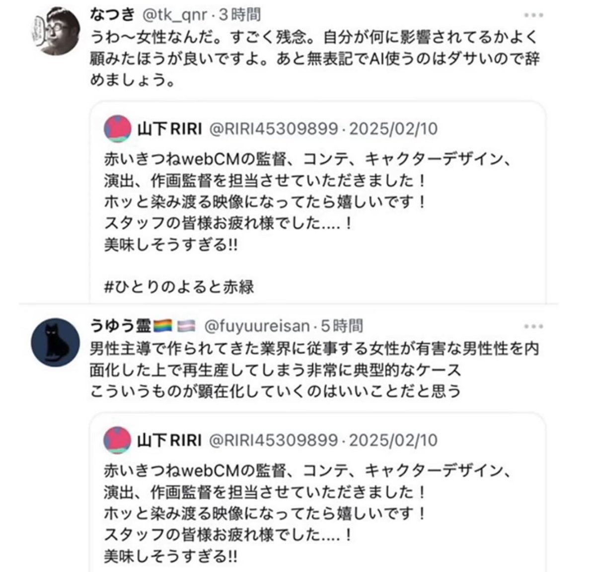 卻也引來了原本批判廣告的群眾,認為山下RIRI居然身為一個女性動畫師,卻在自己的作品中賦予這種男性對女性的妄想價值觀,直呼是否被男性主導的動畫業界洗腦,認為她的作品就只是要媚男而已,甚者也有部分直接對她人身攻擊。