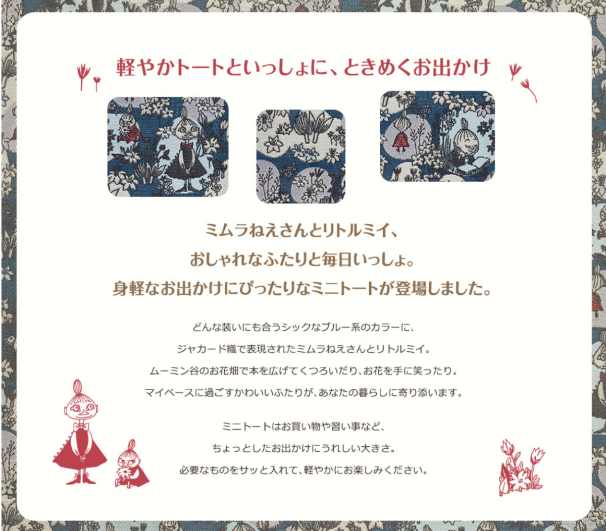 日本販售動漫周邊的電商網站 I・E・I オリジナルショップ,先前發行《嚕嚕米》小不點 ( Little My ) 的真皮短靴,這次再加碼以小不點與姐姐美娜 ( Mymble )其為主題,推出了「小不點 & 美娜輕便迷你托特包」 。售價為 21,780 日圓,目前可於官網預定。