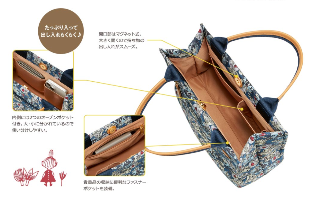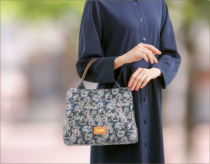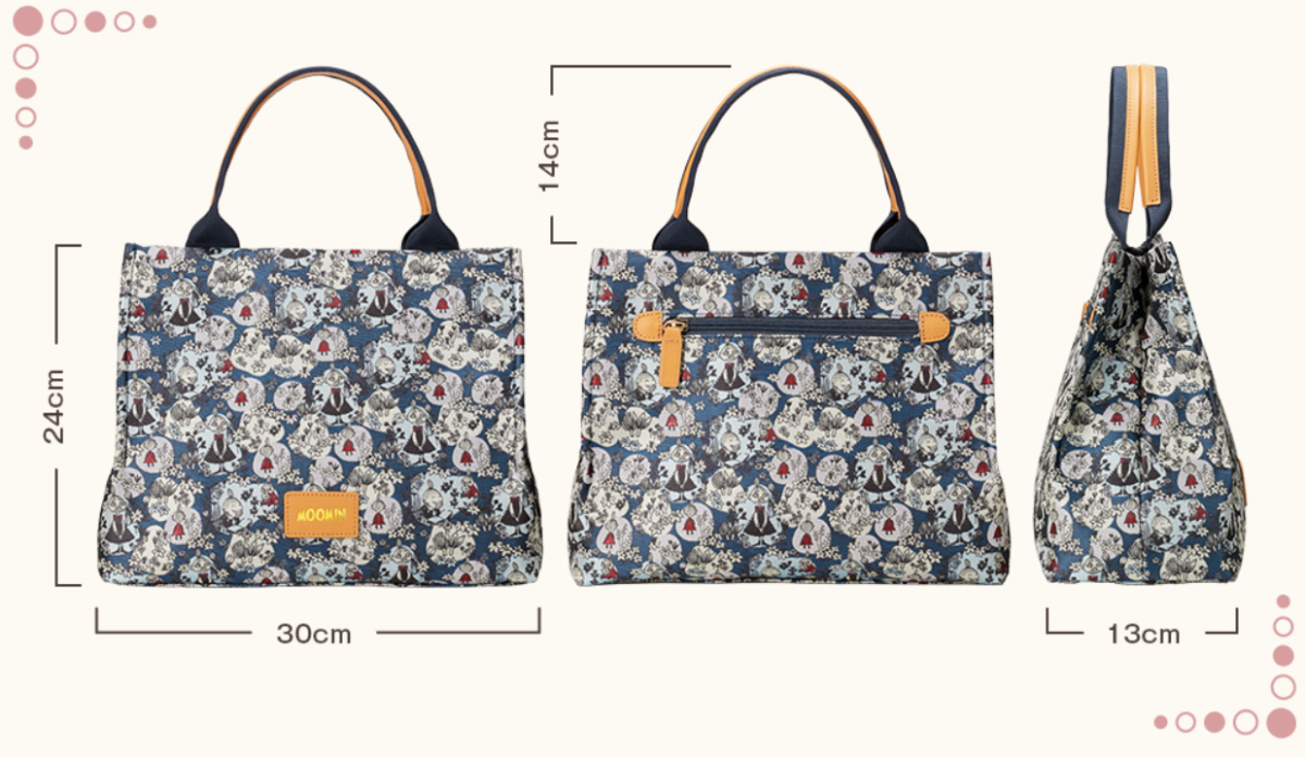 包包採用優雅的深藍色調,搭配精緻的提花織布,呈現出美娜姊姊和小不點的日常場景——有時悠閒地坐在嚕嚕米谷的花田裡看書,有時手拿花朵開心地微笑,展現她們自在愜意的生活風格。