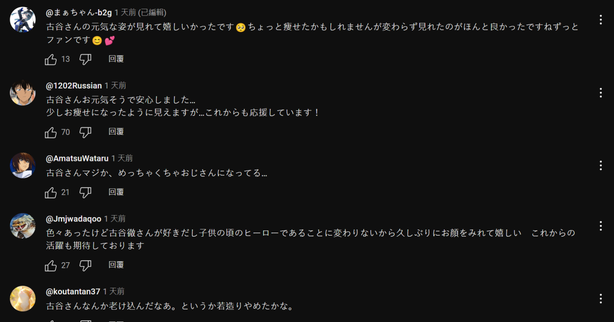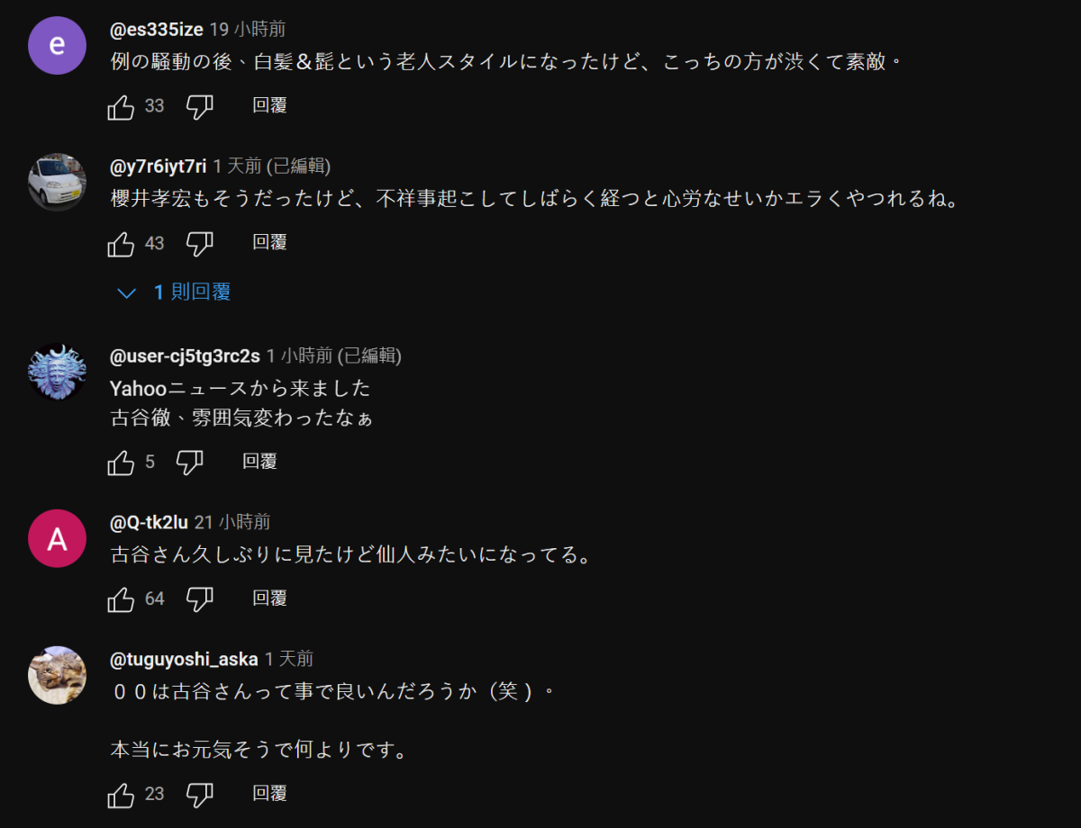 久違露面的古谷徹,蒼老的外貌讓粉絲驚訝不已,影片底下湧入大量留言:「好久沒看到古谷先生,怎麼變得像仙人一樣?」、「這真的是古谷徹嗎?看起來瘦了好多……一直沒消息,還蠻擔心的,看到他還算健康就好」、「天啊,他激瘦了,還好嗎……」、「雖然變白髮+鬍鬚的老爺爺風格,但感覺更有男人味了」。