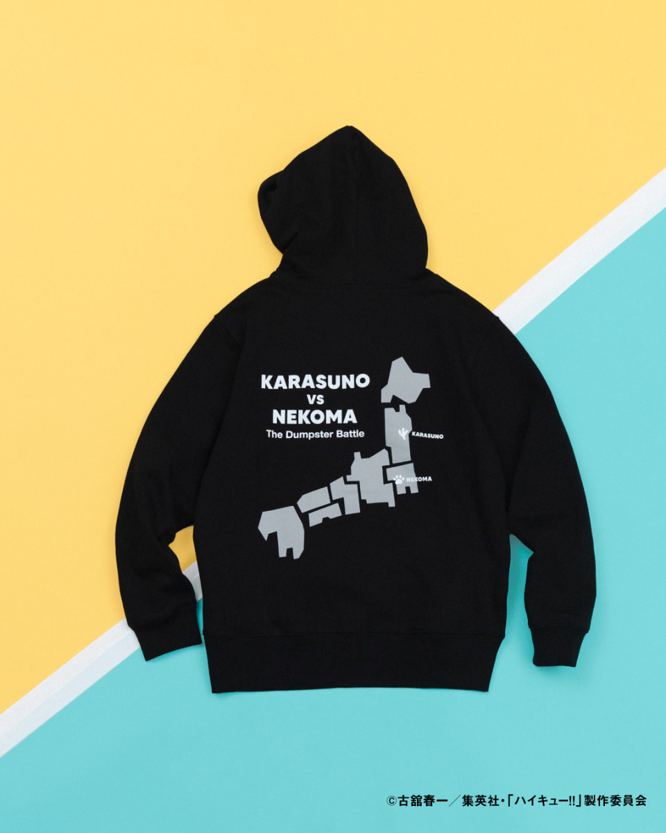 烏野與音駒的象徵動物——烏鴉與貓咪圖案並列,背後還有日本地圖加上烏野 & 音駒所在地標示,特色非常顯目。