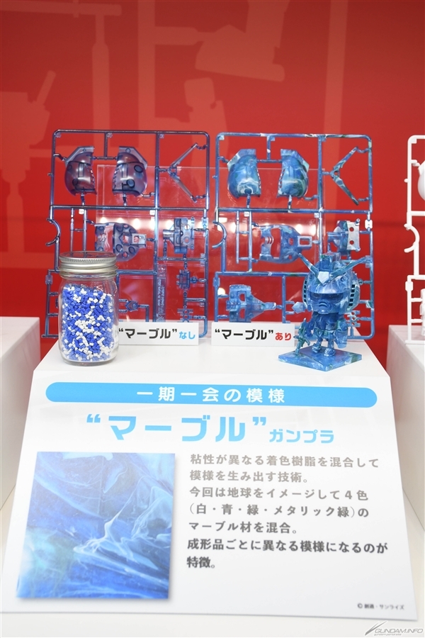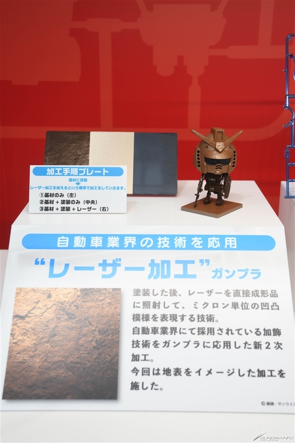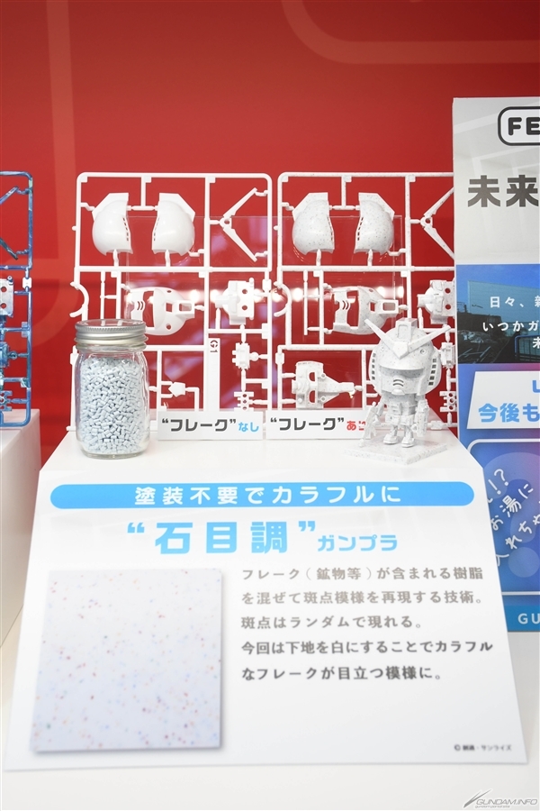 這次萬代公佈的多項新技術基本也屬於後者的大眾化策略,展出的試作品中包含將汽車業界技術活用,呈現地表般岩石質感的「雷射加工」、在樹脂中混入礦物等碎片的「石紋配色」、將不同黏性的著色樹脂混合成型的「大理石紋配色」等技術。