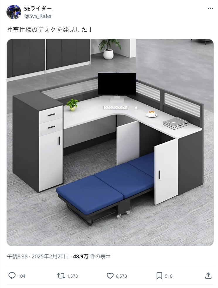 近日日本 X 上,有推主在家具網站「kaguyasu」發現一款很特別的辦公桌,這還附有床位的樣貌被他戲稱為「社畜專用辦公桌」,分享在 X 上後立刻引起不少網友關注,甚至有人真的想買起來。