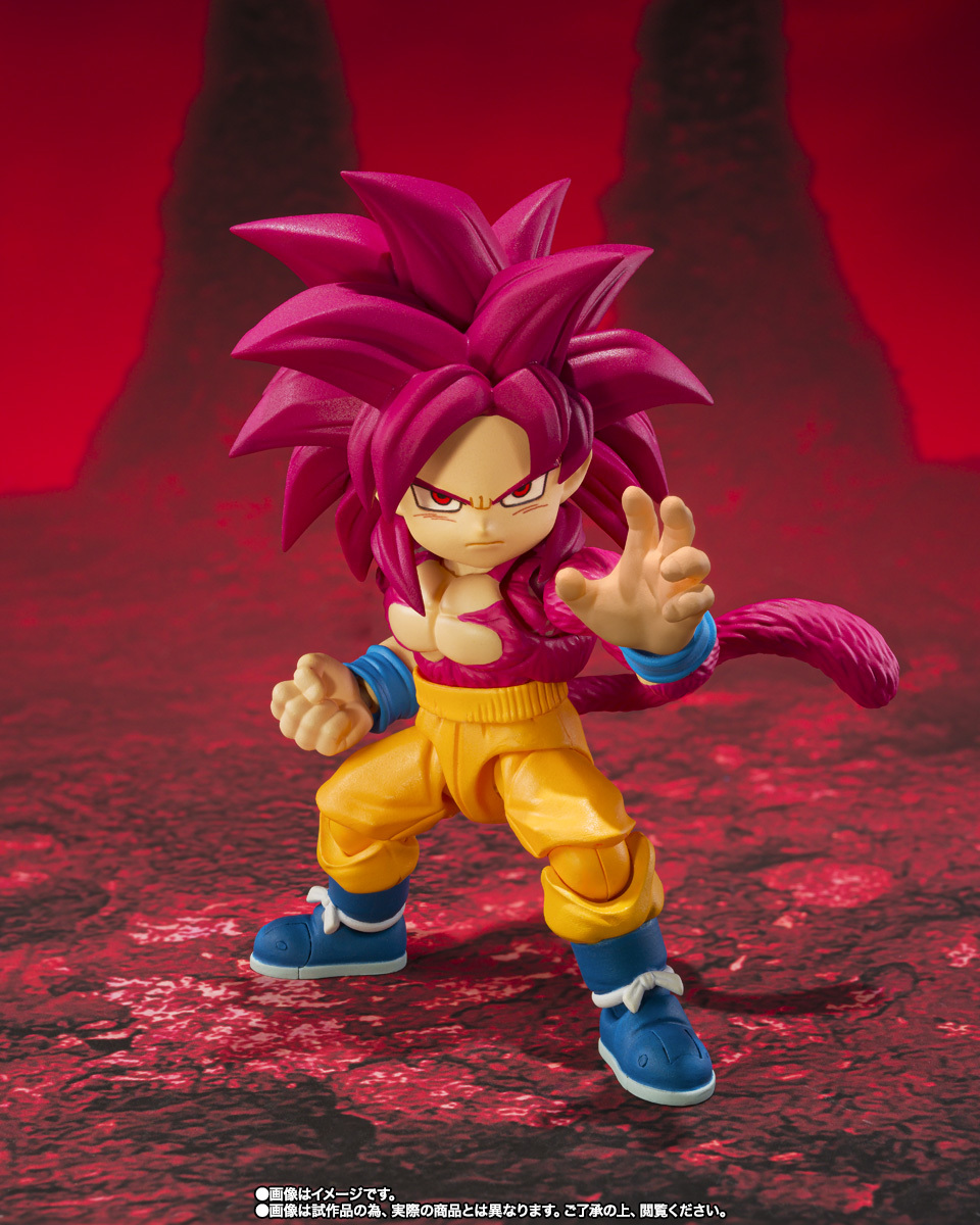 「S.H.Figuarts 超級賽亞人4小悟空-DAIMA-」可動人偶,雖然尺寸僅約高 8 公分,但憑藉著在系列中開發的可動結構,即使是小尺寸也能重現劇中的各種動作!還原變身後身體長出桃紅色毛髮的造型,髮色與眉毛也都變為桃紅色,紅色的瞳孔相當銳利;壯碩的胸肌和毛髮紋理都有仔細的刻畫!除了無表情的標準臉外,還有笑臉和咬牙臉,以及兩張嘴巴張開程度不同的吶喊臉可以替換。能重現與第三眼對戰的一系列龜派氣功姿勢!