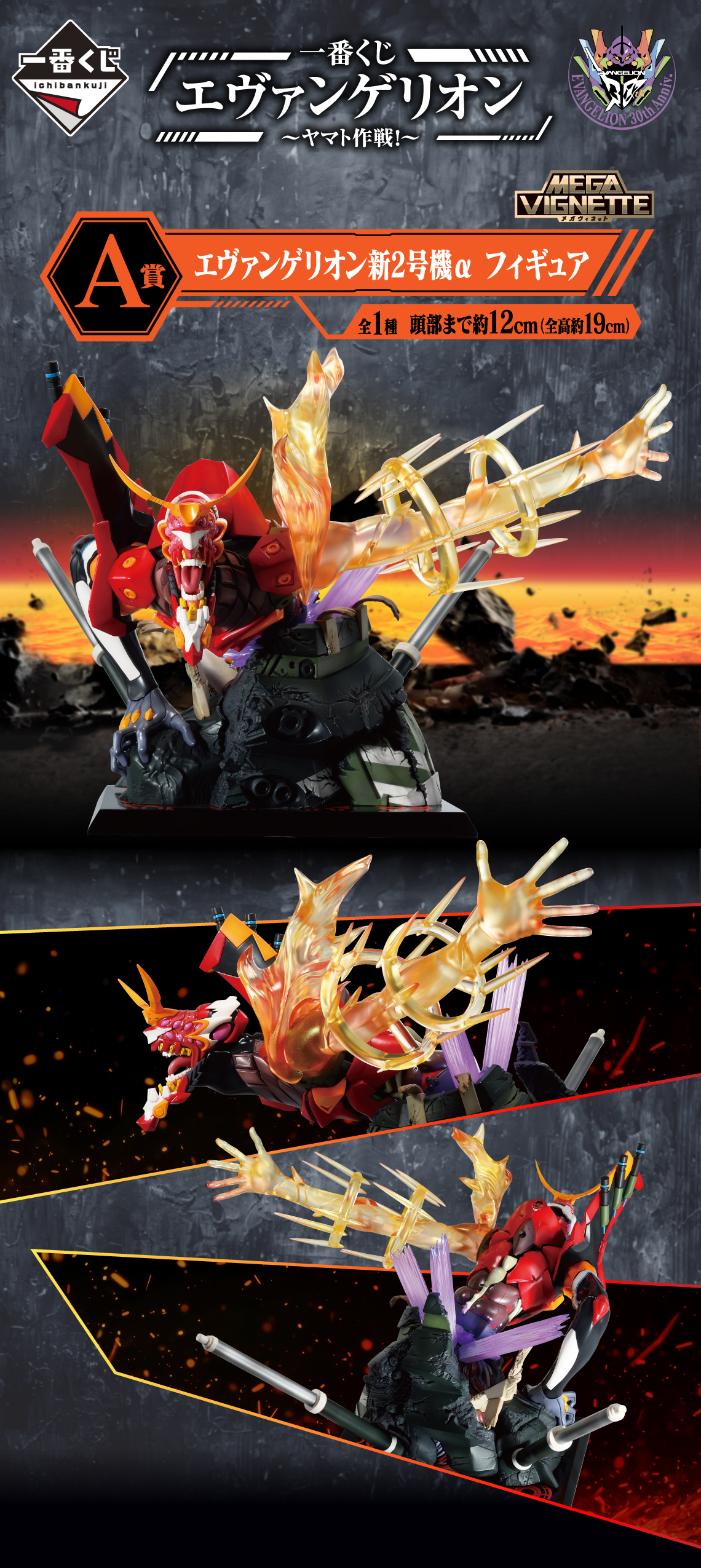 本次的「新世紀福音戰士~大合作戰!~」將提供A~G、最後一賞與雙重中獎賞等不同級別的賞品,目前搶先公開了A、B、C、D賞的角色模型,A賞的EVA新二號機α採用的是《福音戰士新劇場版:終》南極決戰時借用使徒之力突破新2號機α的AT力場的造型,以透明左手特效件再現從JA-02部件竄出的魄力姿態!