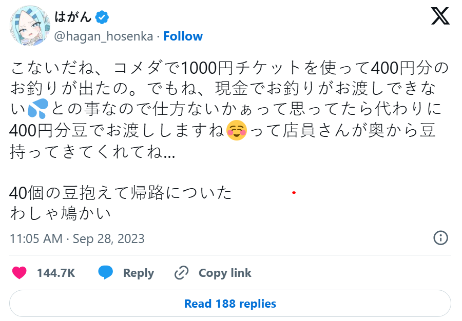 近日一位日本推主在 X 上分享自己到客美多用餐時,分享因為店家希望他們從 4 人座位換到 2 人座位,幫忙移動東西後,店員表示 : 「雖然有點少,不過這是我們的小小心意……」,結果拿了滿滿一大堆豆子,這數量真的讓人感覺壞掉了!