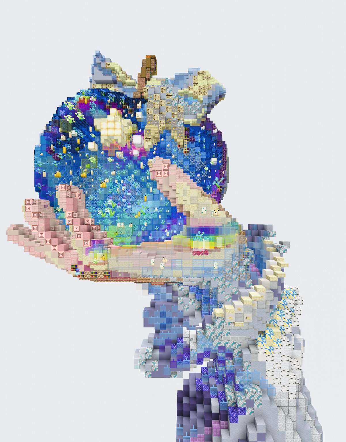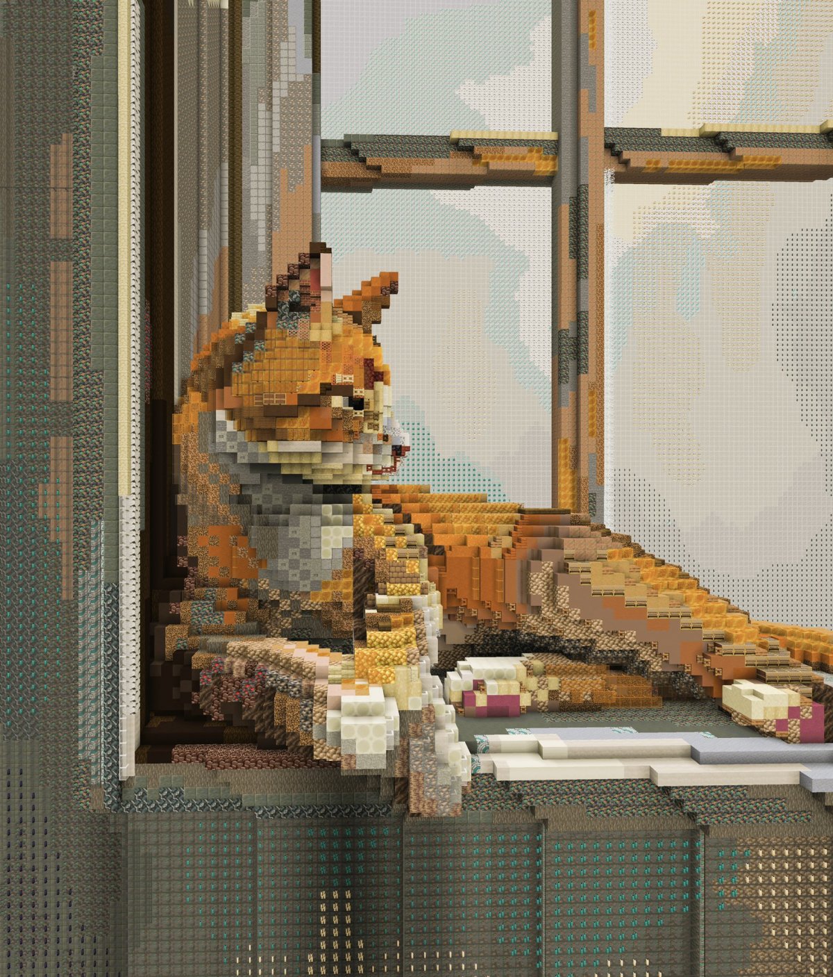 這次的作品呈現了一隻優雅地坐在窗邊的貓咪,身體微微扭動,彷彿正在凝視遠方。創作者透過細膩的方塊排列,成功還原了貓咪柔順的曲線感。尤其是不同彩度的方塊組合,不僅表現出毛髮的層次,更讓光影變化更加自然,使整體作品更具真實感。