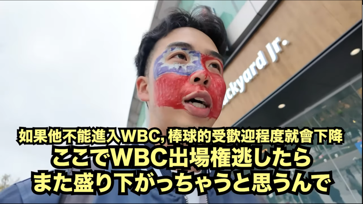 昨日台灣與西班牙的殊死戰,他也特別在臉上畫上台灣國旗來相挺,但他也表示,其實有點好奇,為何台灣需要參加這場資格賽,畢竟台灣棒球的實力是相當優異的。如果台灣沒有辦法晉級 2026 年的 WBC 正賽,身為熱愛台灣的人來說,會覺得很孤單。