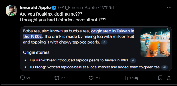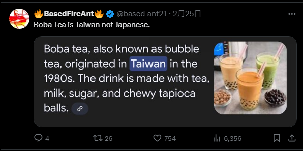 大多數人都知道,珍珠奶茶的發源地來自於台灣,並且成為紅遍全世界的國民飲品。然而,《刺客教條:暗影者》的背景則是設定在日本戰國封建時代,因此這項聯名合作的飲品一出,有部分網友跳出來質疑「育碧是不是分不清楚日本跟台灣」,甚至還紛紛曬出Google搜尋到的資訊,張貼在《刺客教條:暗影者》的 X(前Twitter)推文下方,以此諷刺官方。