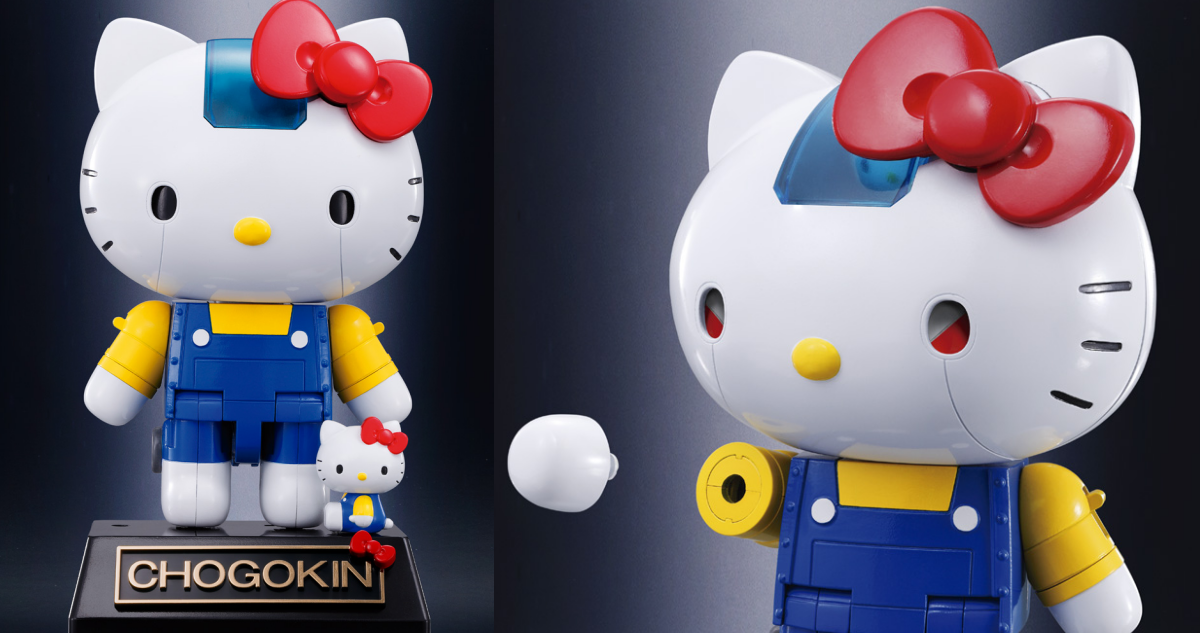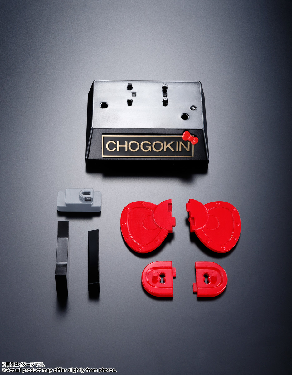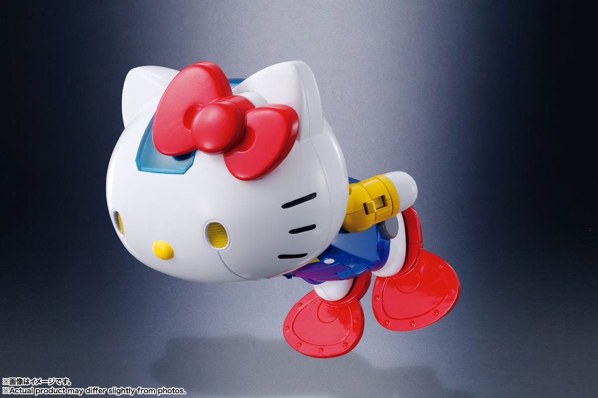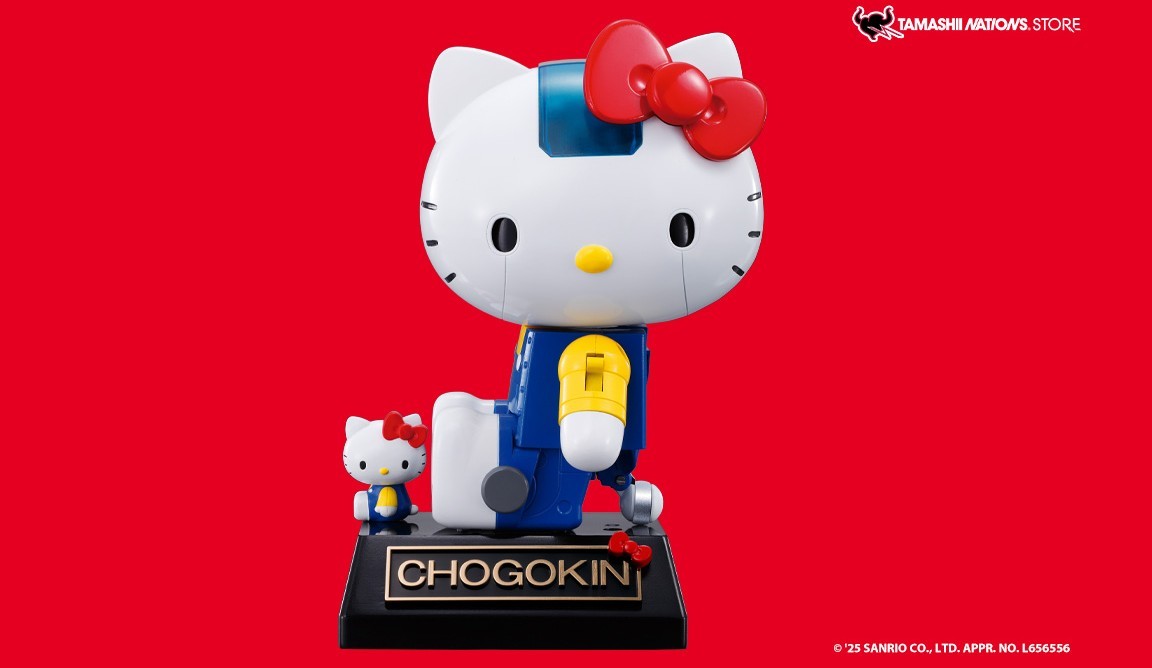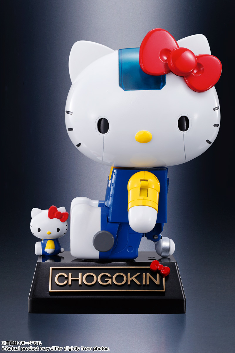 「超合金 HELLO KITTY -STORE LIMITED EDITION-」,尺寸約高 11 公分,在 HELLO KITTY 可愛的貓型外觀中注入機械元素,以及可動變形設計!除了經典的側坐坐姿之外,還有行走狀態、蝴蝶結變成翅膀的飛行狀態、蝴蝶結變成蛙鞋的水中狀態等不同模式,眼睛也有一般、黃色和生氣的紅色三種效果可以切換,小拳頭還可以發射攻擊!並配有 HELLO KITTY 迷你駕駛員,除了可以擺放在身旁,也能置入頭部的駕駛艙中~底座的「CHOGOKIN」字樣與原版本大不同,但小小的蝴蝶結一樣可愛!