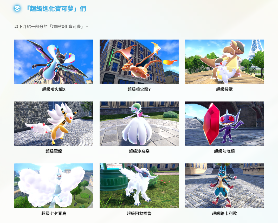 重返卡洛斯地區中心的「密阿雷市」,必然就是意味著「超級進化」再度回歸!使要使用主角所配戴的「超級環」,就能夠讓上陣的寶可夢進行「超級進化」,而目前官方也率先公開能夠進行「超級進化」的寶可夢,包含: