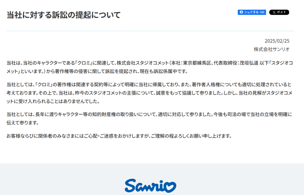 不過直到最近,三麗鷗才在官方網站貼出公告聲明,表示「酷洛米」的著作權已透過相關合約明確歸屬於本公司,並且著作人格權的部分也已適當處理。此外,針對 STUDIO COMET 近期的主張,本公司始終以誠意進行協商,然而對方並未接受我們的立場,所以訴訟仍在處理當中。