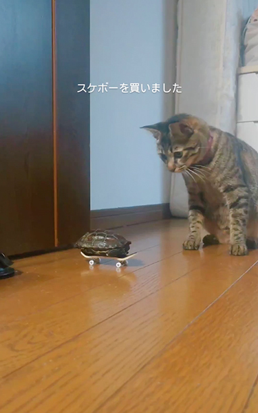 這段影片的主角,是名叫「軍曹」的金龜,與牠最好的朋友,也就是原本是「流浪貓」的小雪。根據飼主 kusa.kame.gunso(@kusa.kame.gunso)的分享,小金龜軍曹特別喜歡小雪,總是努力地跟在她的身後。不過,因為烏龜天生移動緩慢,追趕速度根本無法與靈活的貓相比。為了讓軍曹能更快接近小雪,飼主靈機一動,特別準備了一個小滑板。