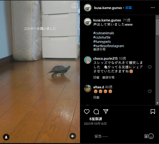 最近,一隻金龜騎著滑板追趕貓咪的畫面在在 Instagram 上曝光後,引發熱烈討論。影片曝光後讓無數網友笑翻,留言紛紛表示:「速度快到嚇到!」「還以為是貓推的,結果竟然是烏龜自己滑」「每次看都忍不住笑出來」。
