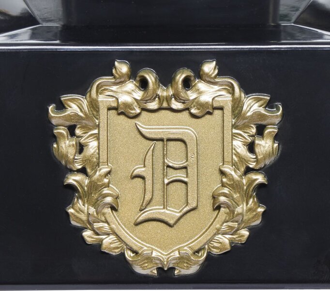 本次的末日博士頭盔參考漫畫中的經典造型,採用塑膠材質以1:1比例打造,雕刻再現金屬色頭盔上的花紋、鉚丁以及刮痕等細節,並附有一頂綠色布製頭巾,可以還原他戴上斗篷兜帽的經典形象!此外還附有一個底座上做有金色末日博士標誌的專用展示支架,不論是收藏展示還是作為扮演服裝配戴都超帥的!