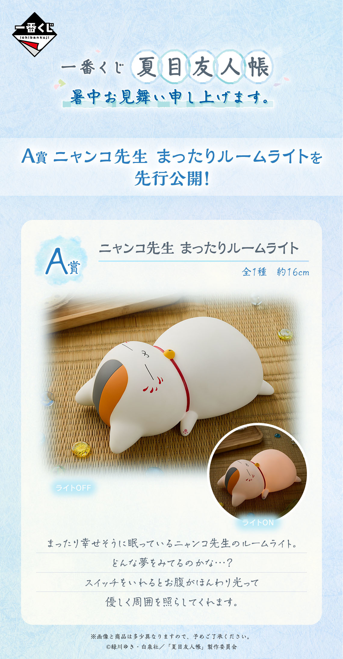 本次的「夏目友人帳 捎來夏日問候」將提供A~G、最後一賞與雙重中獎賞等不同級別的賞品。目前搶先公開的A賞為貓咪老師造型夜燈,將貓咪老師仰躺的模樣立體化,在開啟開關後便會以暖黃色的燈光照亮四周,超級可愛!詳細賞品資訊待日後公開,相當令人期待!