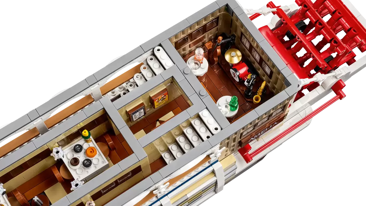 除了精美的外觀,內部也依照「娛樂航程」這一用途做出細緻建構,包含舞台、餐廳、廚房,同時也注入了駕駛艙、船員休息艙室、浴室等頗具真實感的細節,另外還有設置於鍋爐甲板的蒸汽引擎博物館(Steam engine museum),讓你能夠一窺活塞作動與蒸汽機;加上專屬支架,讓你在組完之後能玩能展示,超讚!