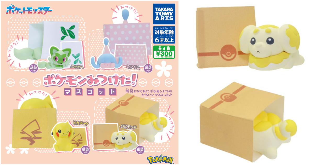 在紙袋裡玩捉迷藏的寶可夢模型,作為「發現寶可夢!」登場~人氣又可愛的寶可夢角色們,雖然想躲起來,但還是不小心從紙袋裡露出一部分身體~藏不住的笨拙模樣真是太可愛啦~首彈收錄有四種寶可夢:皮卡丘、新葉喵、狗仔包、迷布莉姆,每款尺寸約 3.5〜4.5 公分,並配有不同設計的小紙袋,上面印有各自的特色圖樣,無論是躲在紙袋裡露出尾巴或屁屁,還是與紙袋一起擺飾都非常有趣!