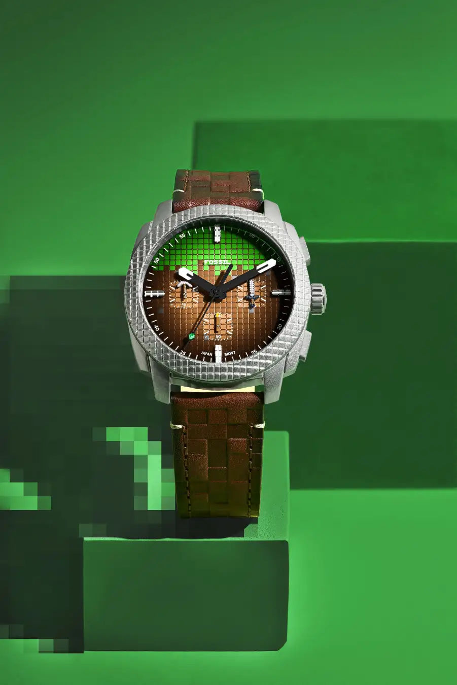 以遊戲初期體驗為靈感,錶盤設計成經典的「草方塊」造型,小錶盤指針分別是 劍、火把、鎬,秒針則是綠寶石,錶圈與皮革錶帶皆有方塊紋理,還原遊戲獨特像素感。