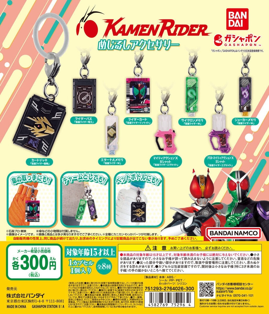 這次分別收錄了《假面騎士龍騎》中龍騎的騎士卡盒、《假面騎士電王》中電王的騎士護照、《假面騎士DECADE》中DECADE的變身卡、《假面騎士W》中的旋風記憶體、王牌記憶體以及ETERNAL記憶體和《假面騎士EX-AID》中的Mighty Action X卡帶和Proto Mighty Action X卡帶共8種款式,讓各位玩具人的物品可以得到來自假面騎士的守護!