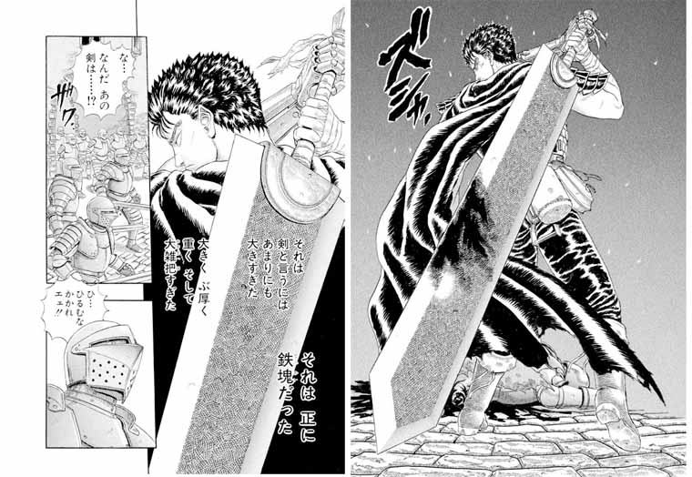身穿全黑色的盔甲和披風,因而得名「黑色劍士」的劇中主角凱茲,各位想到他所持的武器絕對是這把如長度超越自身的厚重大劍「斬龍劍」,原作所評那句:「與其說是劍,不如說是一塊巨大的鐵塊」,絕對是 ACG 代表性的武器之一。