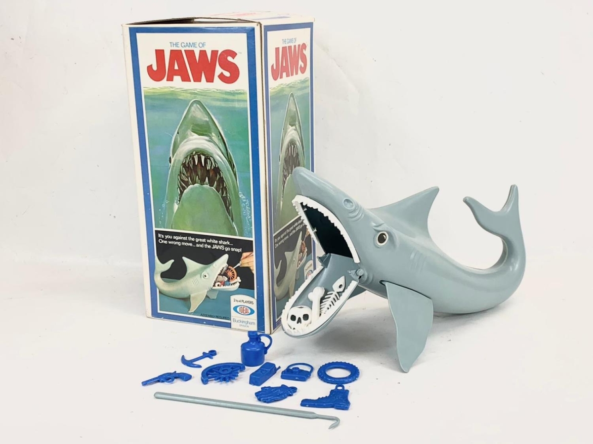 讓我們先回到 1975 年,當時 Ideal Toy Company 根據叫好又叫座的《大白鯊》推出了一款同名玩具「大白鯊遊戲 (The Game of Jaws) 」。這款以食人巨鯊「布魯斯」為主角的桌遊玩法是要把一共 13 個零件放入布魯斯口中,並利用魚叉一個個將其撈出來,最先集到一定數量的玩家就能獲勝;不過,在拿出物品的過程中隨時都要小心翼翼,因為布魯斯的血盆大口可能就在下一秒緊緊咬下,讓你出局!