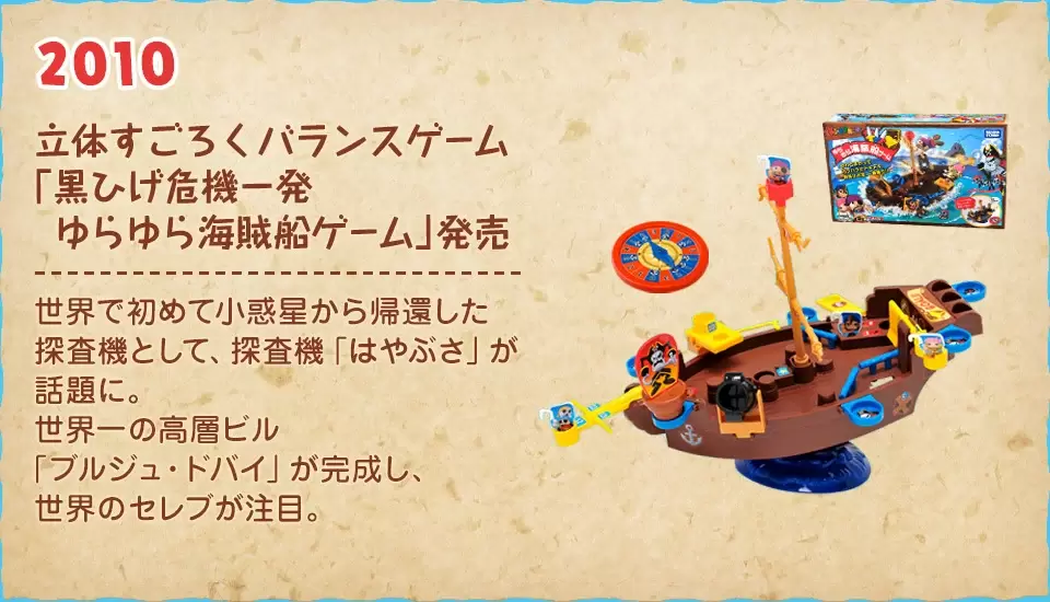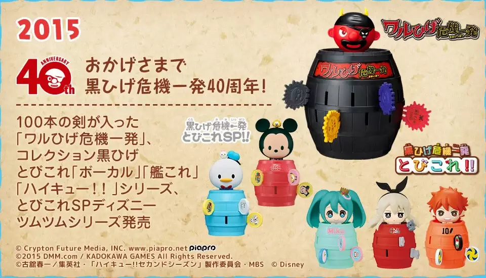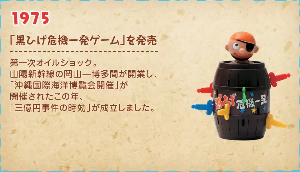 這款把劍插進木桶、藉此彈出黑鬍子海盜拯救夥伴(或是避免讓海盜被彈飛)的黑鬍子危機一發遊戲,自 1975 年販售第一代商品以來除了在玩法做出更動、可以自定義各種遊戲規則之外,玩具本體也不斷做出改良與更新,包含彈飛速度加快、一次飛出五個黑鬍子海盜、跟迪士尼與各大作品展開聯名,甚至還有推出超豪華的海盜船造型變體版。相信至今還是許多玩具人會選擇的最佳破冰小遊戲。