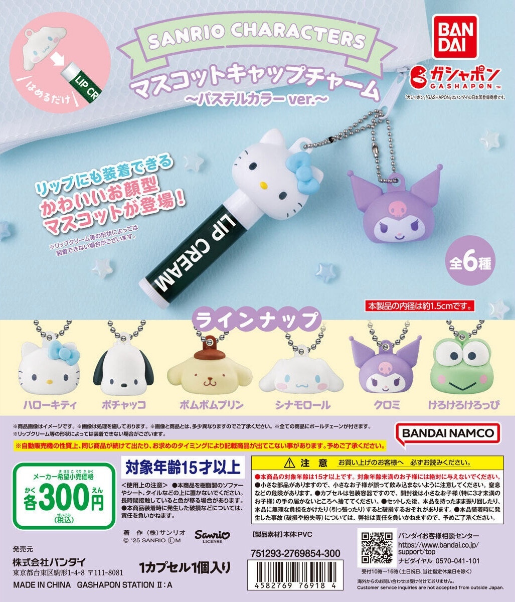 日本萬代公司轉蛋事業部 GASHAPON 推出以超人氣的三麗鷗明星為主題的新商品——「三麗鷗明星造型蓋吊飾~粉彩色版~」轉蛋,參考售價為每轉300日圓,預計於2025年03月第五週發售!
