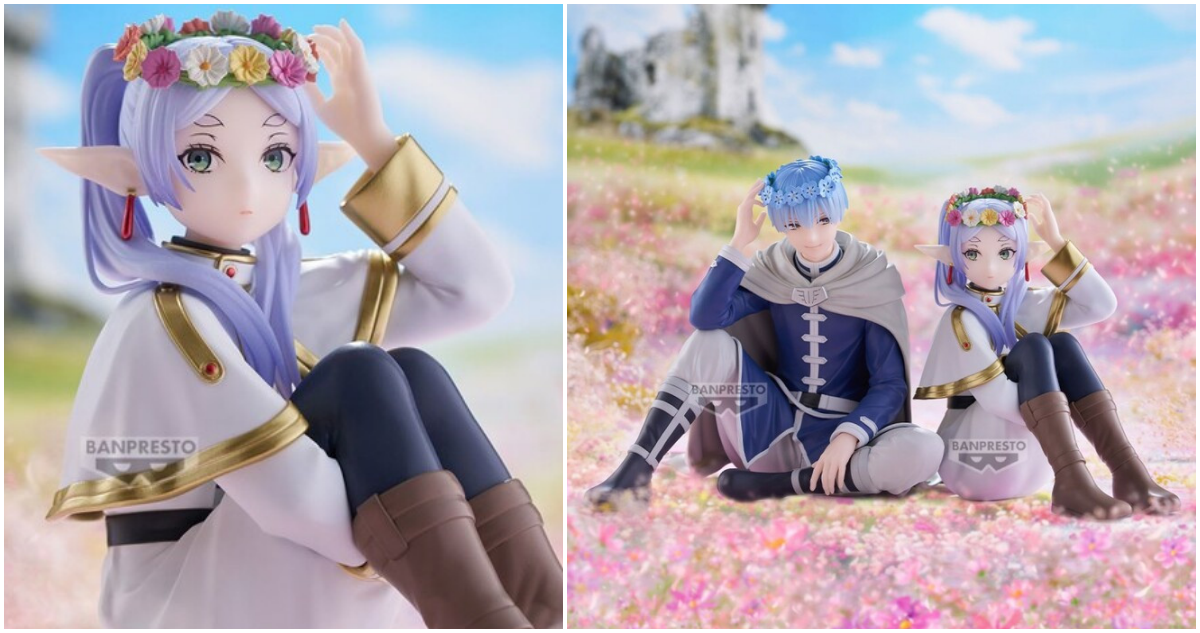 BANPRESTO景品「ESPRESTO-Flower Crown-芙莉蓮」,尺寸約高 13 公分,以芙莉蓮頭戴著花圈、坐在花海中的唯美景象為造型,優美地刻畫出一手拂著花圈的動作;白金色主調的小斗篷施以質感的金邊塗裝,小粗眉和淡淡的表情超級可愛!與另售的欣梅爾一起收藏,可以呈現出兩人並肩而坐並偷瞄著彼此的模樣...嗚嗚嗚!