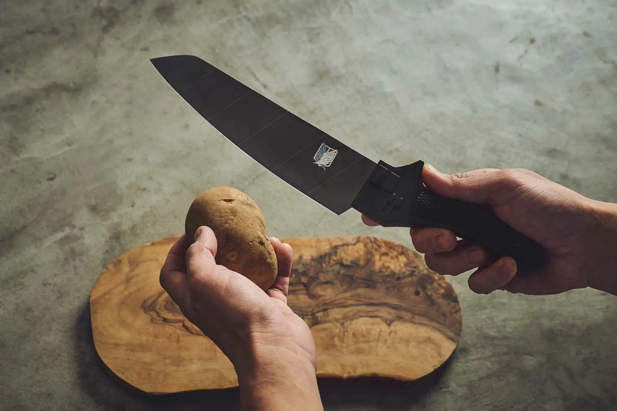比一般三德刀尺寸更小,適合細緻刀工,輕鬆處理蔬果、肉類、雕花等料理細節。刀身上刻有與動畫中「超硬質刃」相同的斜紋線條,也配上象徵調查兵團的「自由之翼」,握柄也還原原作設計呈現,並使用全黑塗裝成現。
