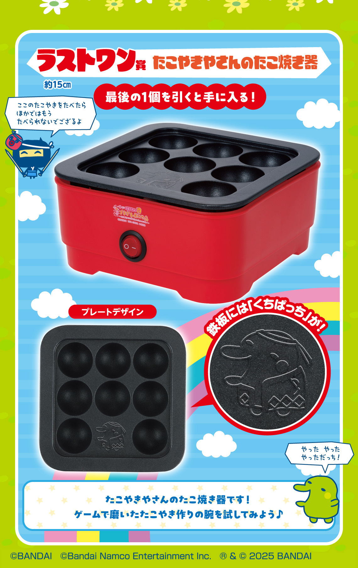 D賞為附有可愛對話的人物模型系列,收錄麻每吉、咕嘰叭吉和麻嚕吉三種款式;E~G賞分別為主題抽繩收納袋、橡膠吊飾及文具系列;而眾所矚目的最後一賞則為章魚燒機,考驗各位在遊戲中磨練的章魚燒製作技巧!每個級別的賞品都印有塔麻可吉的小商店主題的插圖,即便沒有遊玩過這個經典遊戲也可以享受塔麻可吉的可愛魅力!