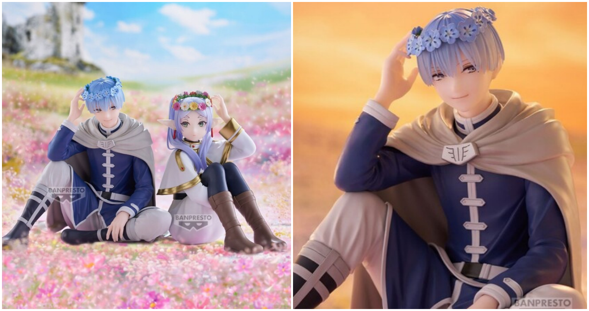 BANPRESTO景品「ESPRESTO-Flower Crown-欣梅爾」,尺寸約高 15 公分,採用漸層的透明件還原欣梅爾年輕時的藍色短髮,營造出清透感的同時也露出俊秀帥氣的臉龐,向旁邊看的眼神與笑容流露出寵溺的浪漫氛圍。頭上戴著別具意義的蒼月草花圈,與另售的芙莉蓮一起收藏,可以呈現出兩人並肩而坐並偷瞄著彼此的模樣~