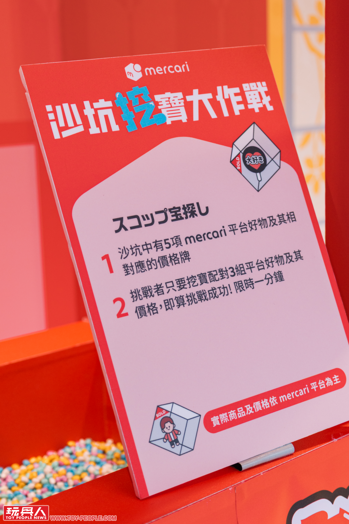 今天我們來到的是位於台北三創、為期三天(3/14-3/16)的活動現場,另外兩個週末活動的時間則是上週(3/7-3/9)的西門紅樓,以及下週(3/21-3/23)的信義ATT。Mercari城市挖寶巡迴號一共分成三大區域,分別是「Mercari我們的房間」、「沙坑挖寶大作戰!」跟「花札挖寶」,其中更在兩個挖寶區設置了如同日本祭典一般熱熱鬧鬧的「Mercari挖寶挑戰賽」。那麼,我們玩具人現在就跟阿傑一起玩玩看。