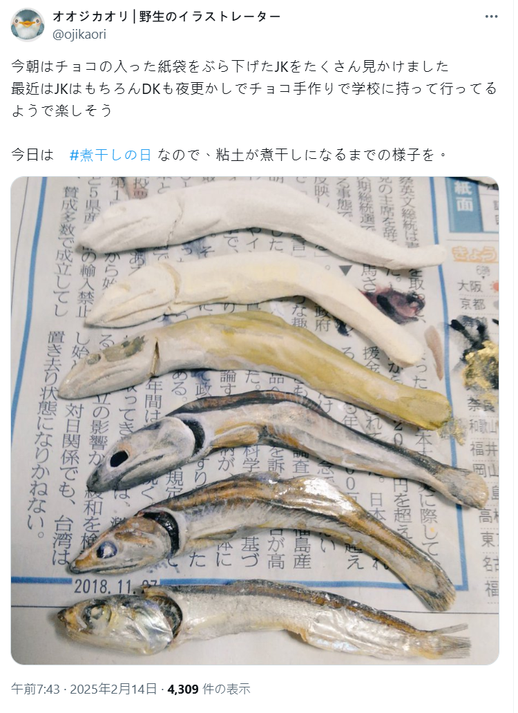 オオジカオリ也曾用黏土創作,繪製漸漸成形的煮干,最下面的是真正的煮干,足以看出他的繪畫功力真的逼真。