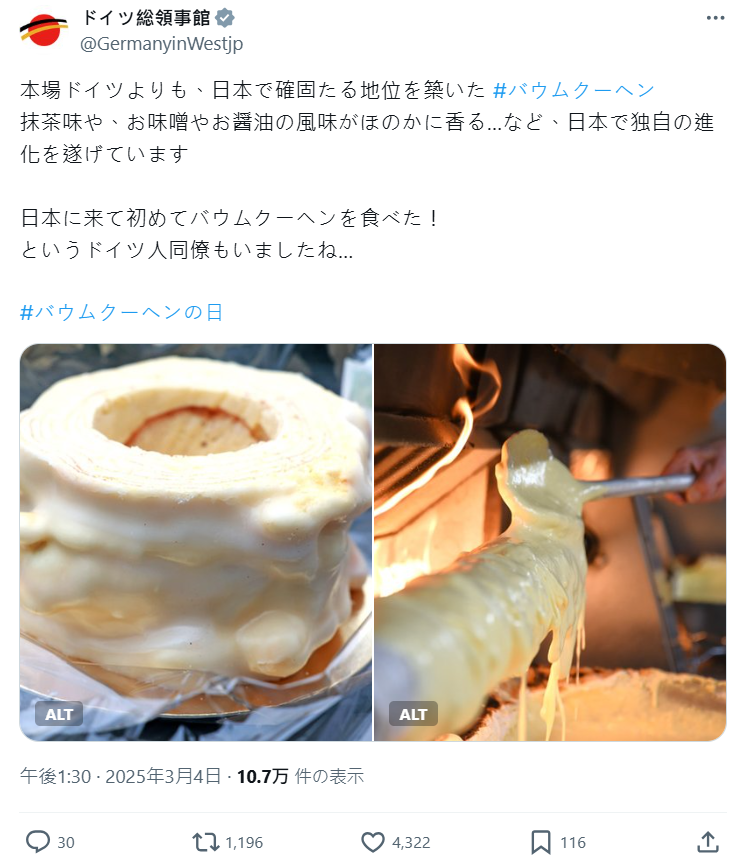 日本德國大使館貼文表示,年輪蛋糕在日本的地位,比起發源地德國還要穩固!還發展出抹茶口味,甚至還有淡淡味噌或醬油風味……可以說是在日本獨自進化了,甚至還有德國同事來到日本後才第一次吃到年輪蛋糕呢……