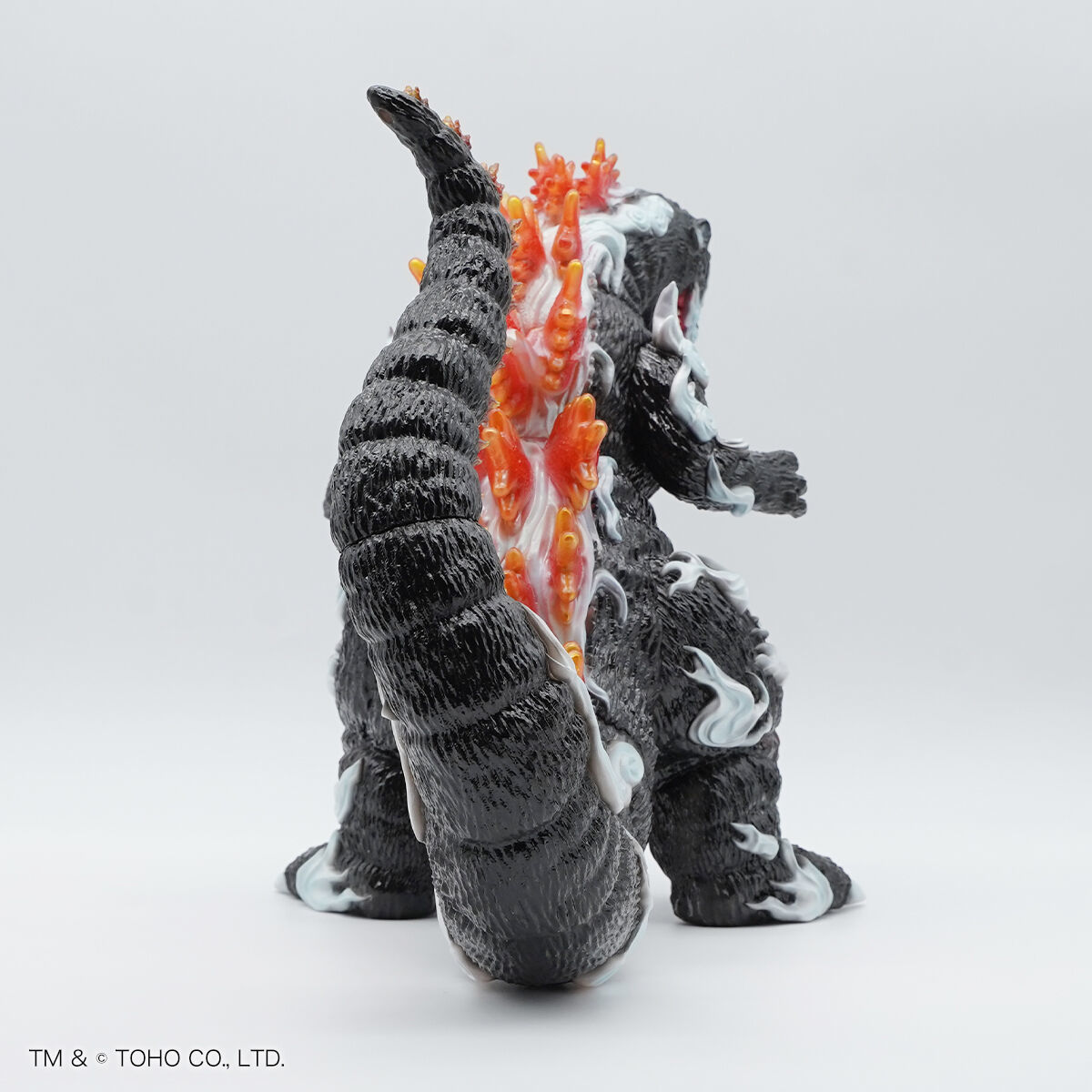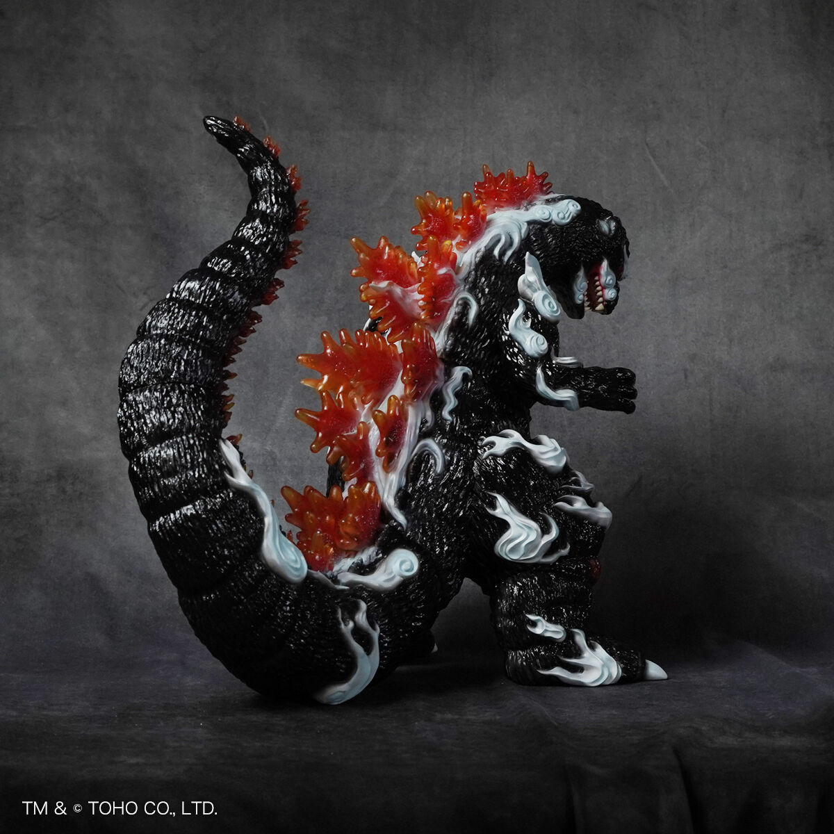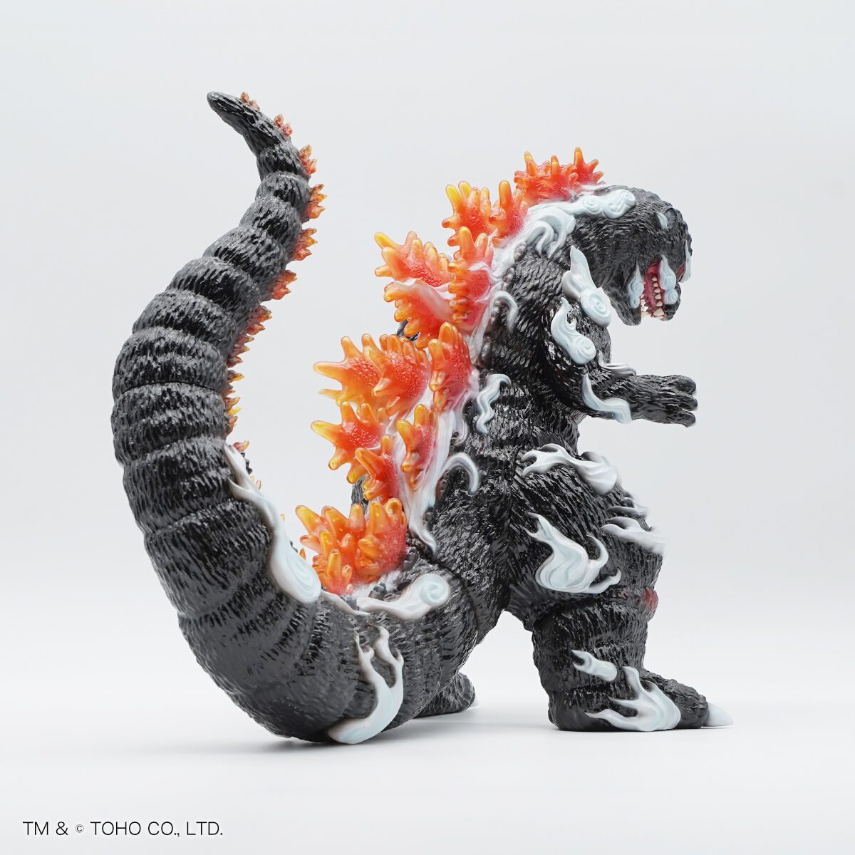 尺寸約高 33 公分,整體彷彿直接從畫卷中走出來,軟膠獨特的精緻色彩營造出滿滿的日式氣息—除了哥吉拉粗糙的皮膚質感細膩刻劃,渾身還繚繞著祥雲,讓人感受到衝擊的流動感;從體內透出的紅蓮塗裝、透明材質的背鰭透出漂亮的紅色光澤,不僅滿滿的狂氣,還相當美麗!