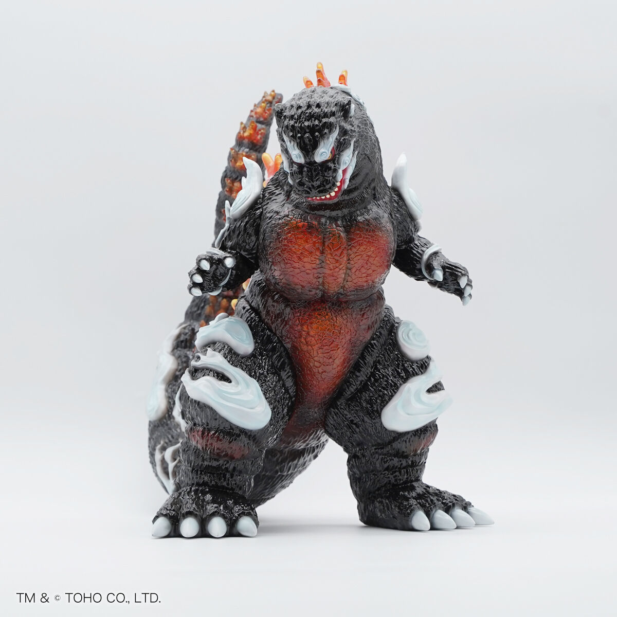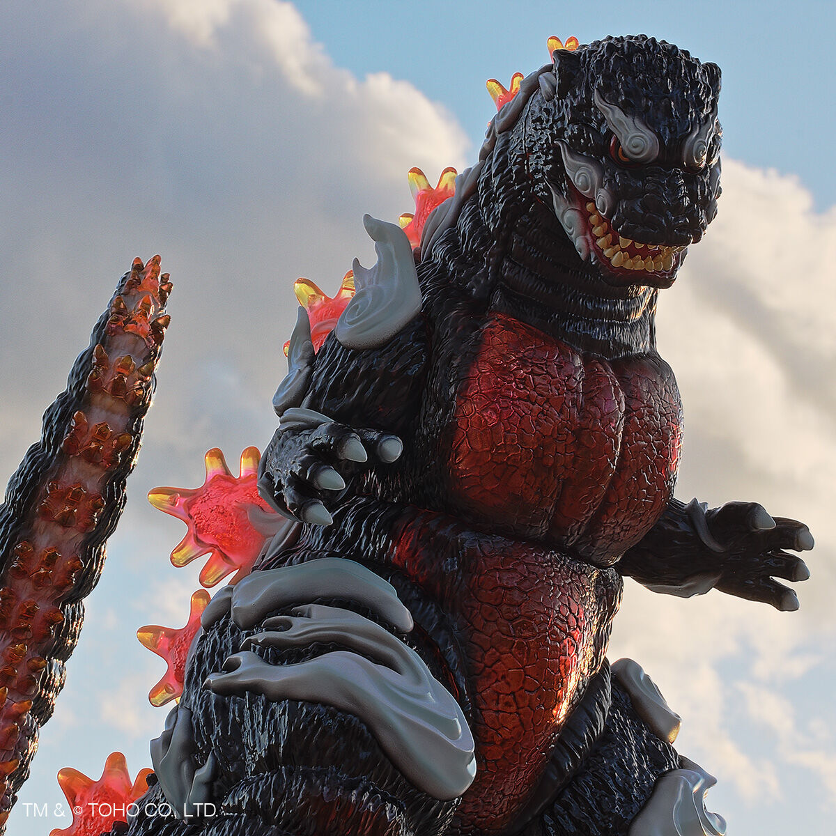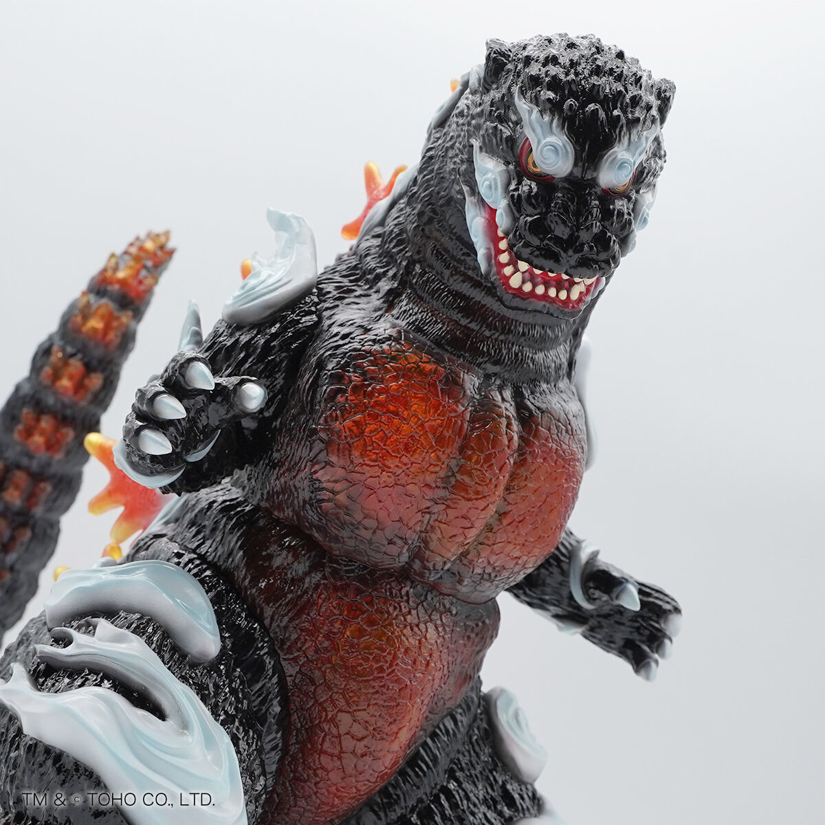 尺寸約高 33 公分,整體彷彿直接從畫卷中走出來,軟膠獨特的精緻色彩營造出滿滿的日式氣息—除了哥吉拉粗糙的皮膚質感細膩刻劃,渾身還繚繞著祥雲,讓人感受到衝擊的流動感;從體內透出的紅蓮塗裝、透明材質的背鰭透出漂亮的紅色光澤,不僅滿滿的狂氣,還相當美麗!