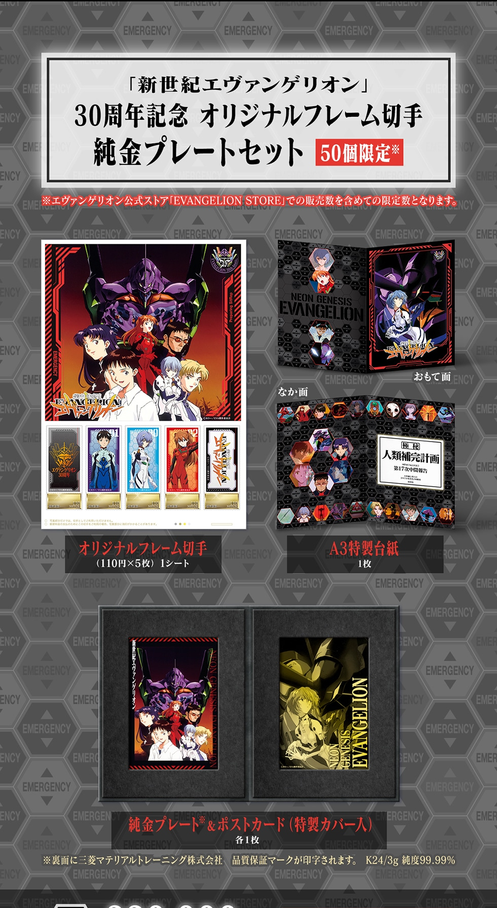 除了原創設計的郵票外,還有 A3 限定台紙,以及重點使用動畫視覺圖,採用純金打造的精美紀念板,以綾波零 & 初號機呈現,配有專屬的收納簿。( 限量 50 組 )