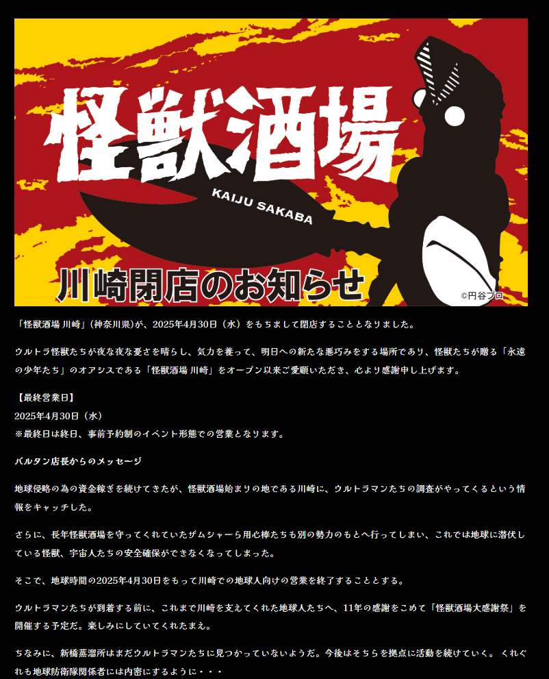 因此,我們決定 在地球時間 2025 年 4 月 30 日正式結束川崎據點的營運。在力霸王們抵達之前,將舉辦 「怪獸酒場大感謝祭」,向這 11 年來支持我們的地球人表達感謝,請大家拭目以待!值得一提的是,另一據點「怪獸酒場新橋蒸餾所」似乎還沒被他們發現。今後,我們將把活動據點轉移到那邊,繼續進行我們的秘密行動。