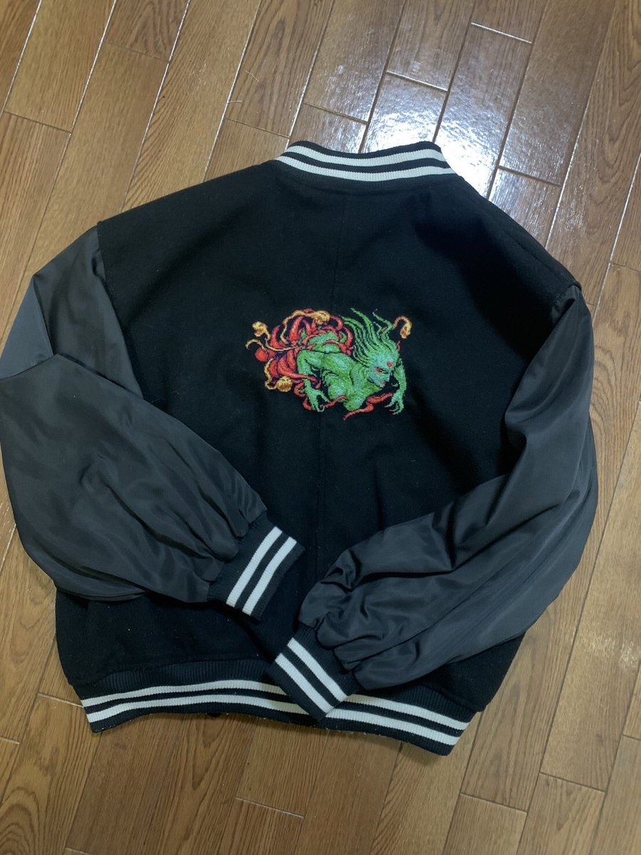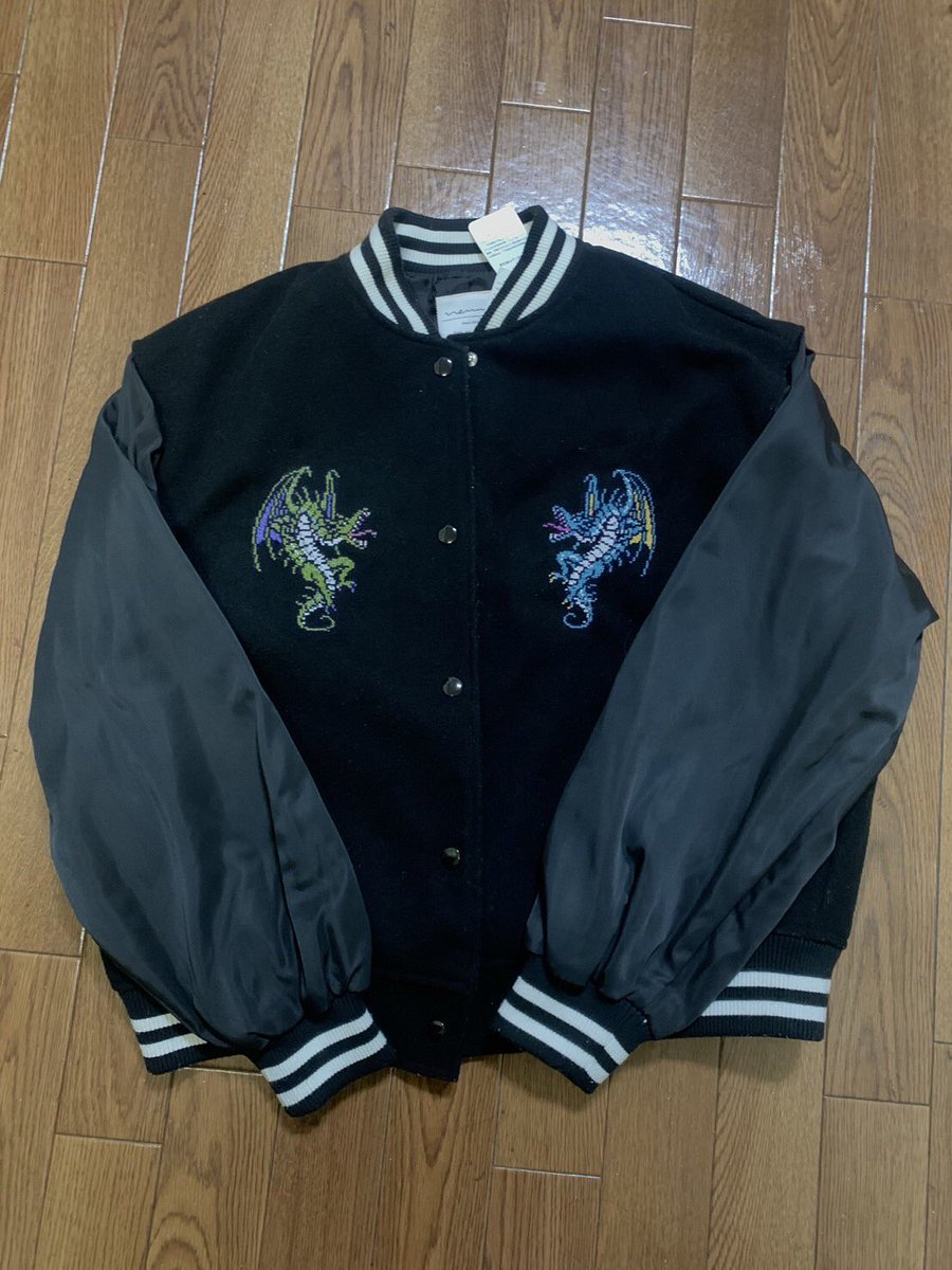 他也將刺繡配置在原先樸素的棒球外套上,一瞬間就展現出懷舊又有特色的樣貌。正面的雙龍刺繡,也是他親手製作而成的。