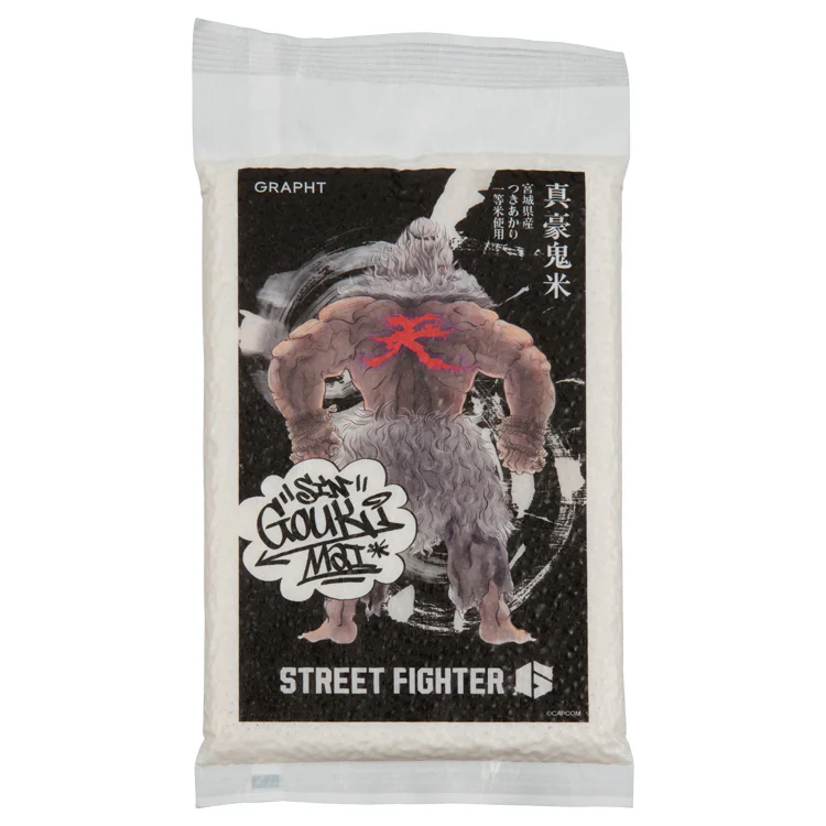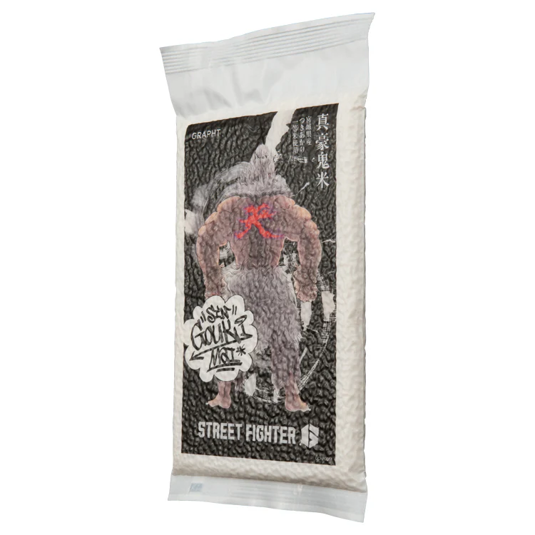選用宮城縣產的「月光米」(つきあかり)」,特點是即使冷掉,口感與風味依然保持絕佳,非常適合用來做飯糰或便當。外包裝則是採用日式水墨風格繪製的豪鬼背影,由 GRAPHT 團隊特別設計,讓粉絲們收藏!