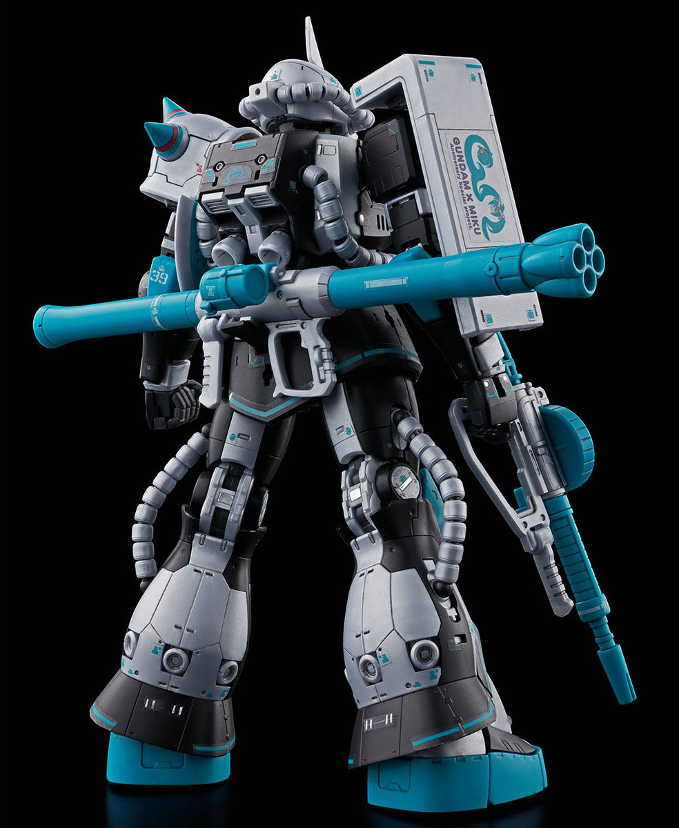 「RG 1/144 MS-06S 薩克II[初音未來Ver.]」基於過去發售的一般版修改而來,套件使用藍綠色、消光黑、灰白色等新規成型色表現初音未來的形象色彩。同時還附上此次合作版本限定的「擬真質感貼紙」,印有此次合作企畫LOGO、初音左肩特徵的「01」編號、與日語「未來」同音的 39 編號...等原創機身標誌。