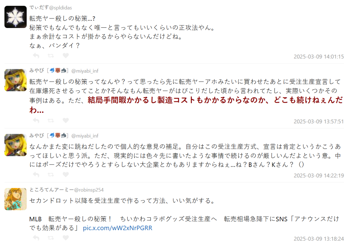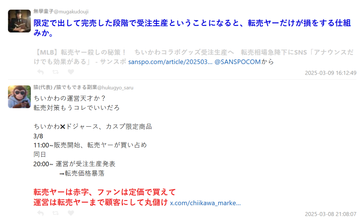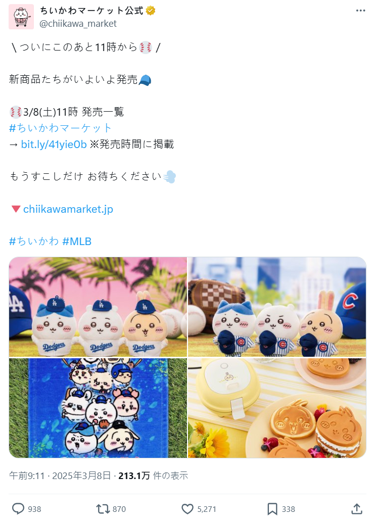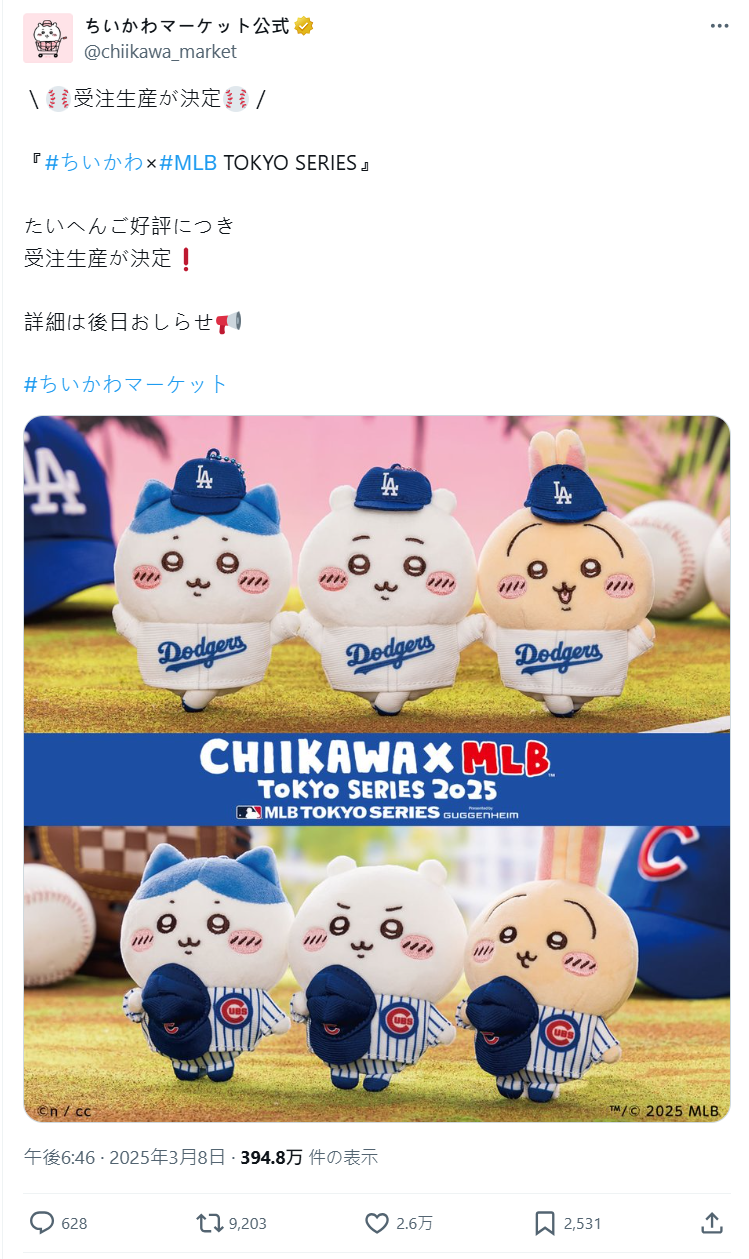 沒想到,官方 X 當天晚上就宣布:「因為『#ちいかわ×#MLB TOKYO SERIES』廣受好評,決定追加受注生產(接單生產)!」也就是說,只要之後開放登記,大家都能用原價買到,不用被黃牛坑。