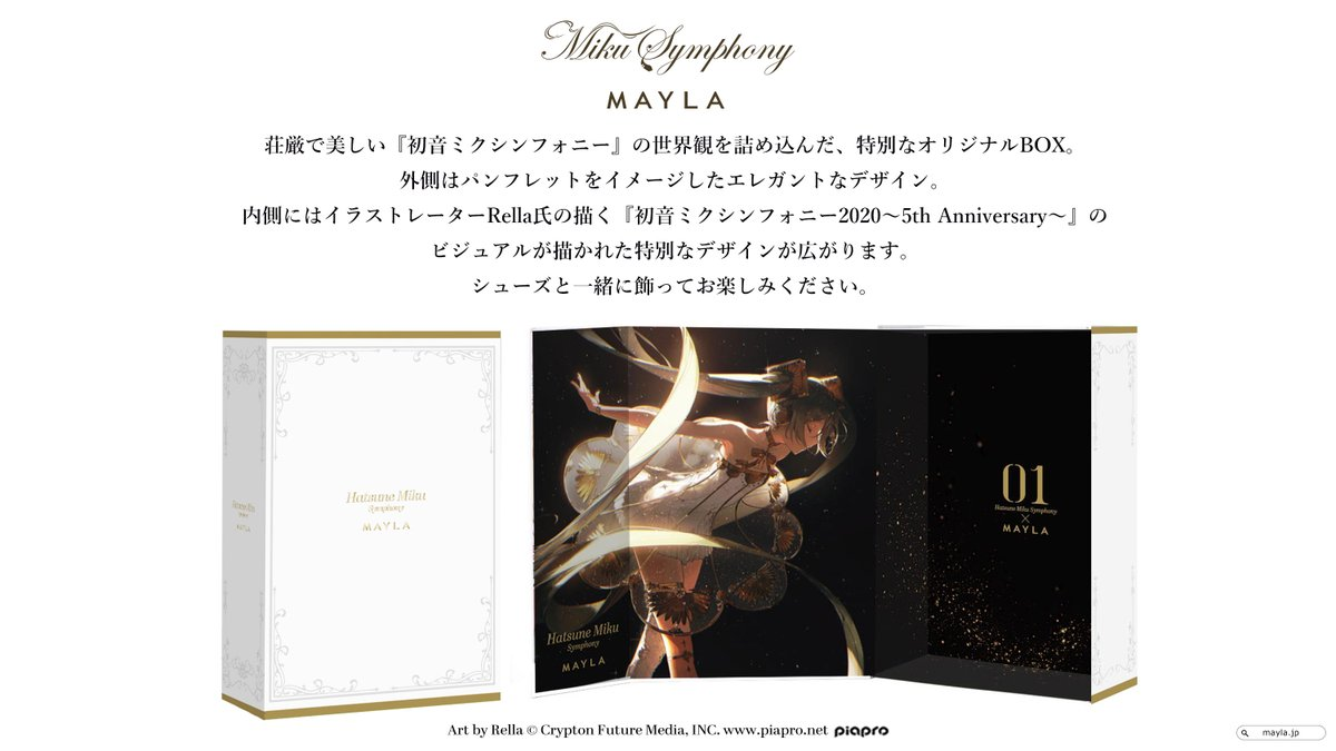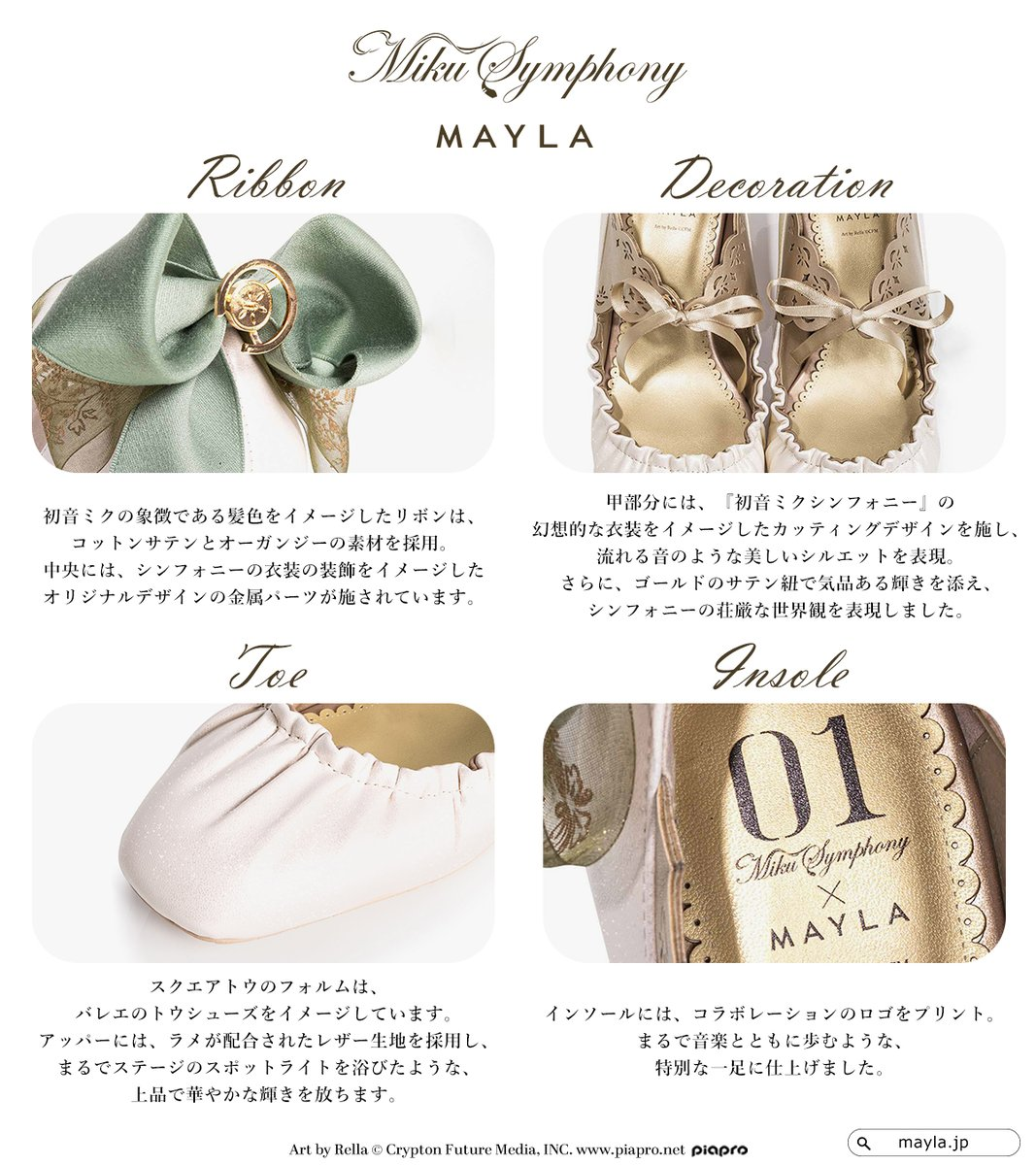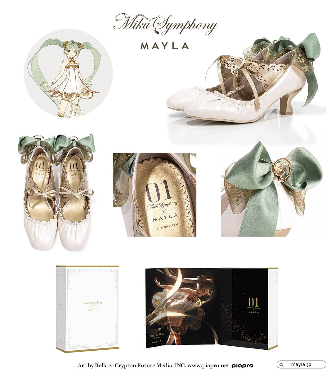 近日宣布與邁入 17 年的虛擬歌姬《初音未來》再次合作,繼先前推出以繪師 magako 繪製初音未來著用的長裙,這次推出「初音未來 交響樂」10 周年的紀念鞋款。售價為 31,350 日圓,目前已可於 MAYLA 官網預購。