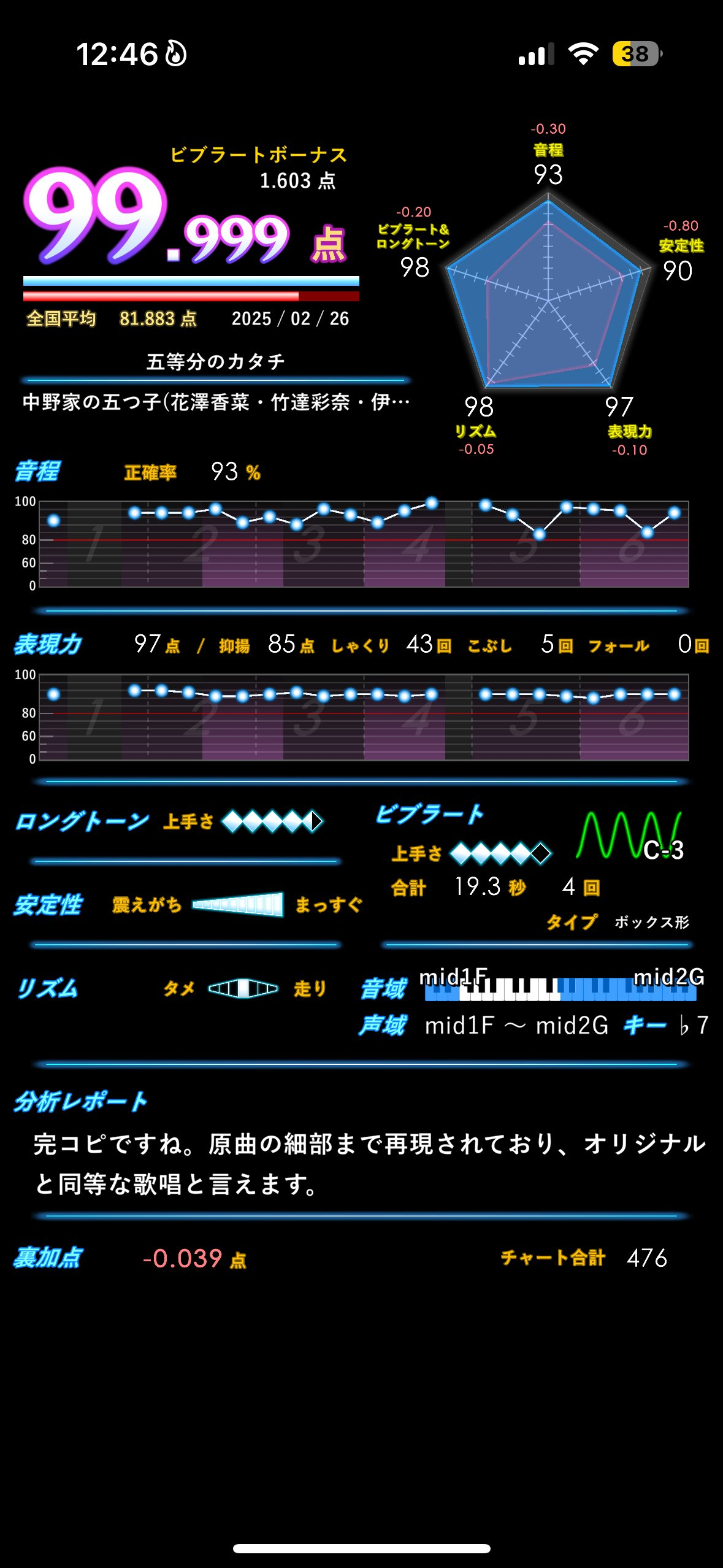 演唱歌曲是動畫《五等分的新娘》第二季片頭曲〈五等分のカタチ〉,而得分不是100分也不是99分,而是99.999分。