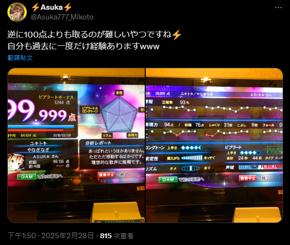 簡直就是差那0.001分就是完美的滿分,但推主根本沒想到能達到這麼精準的評分,就連推文下的網友也覺得這比100分還難拿,而底下也有人分享自己也曾拿過這樣的分數。究竟要怎麼唱才能精準拿到這樣的分數啊...