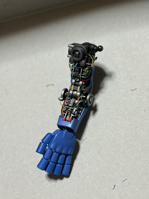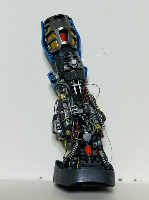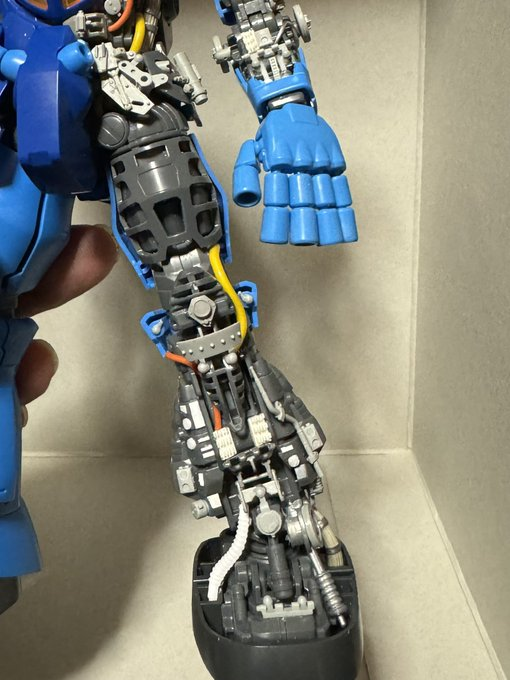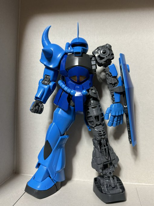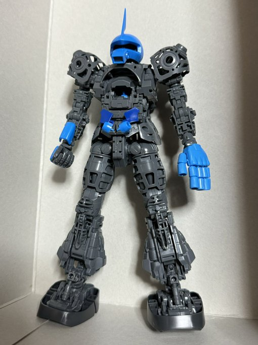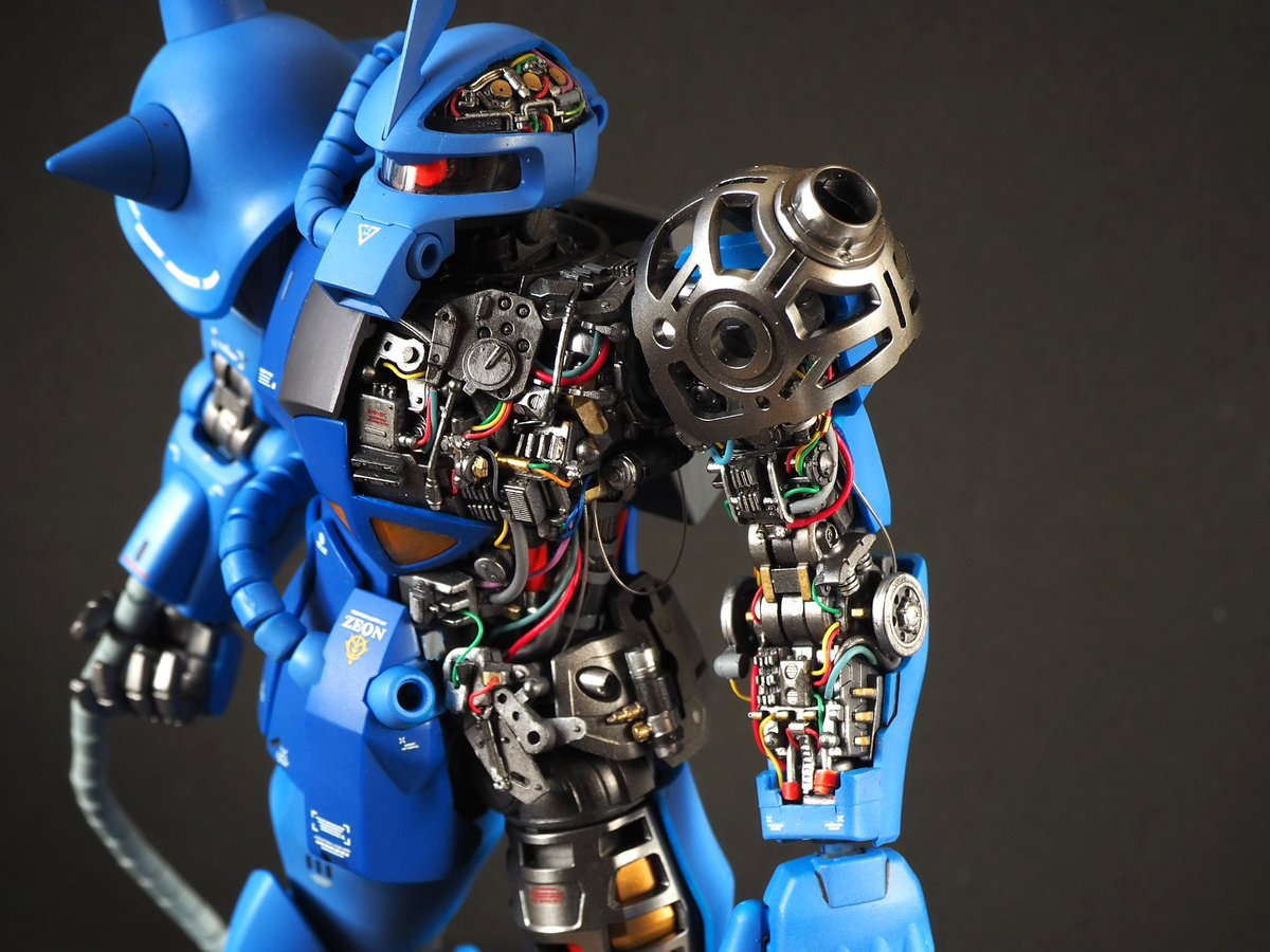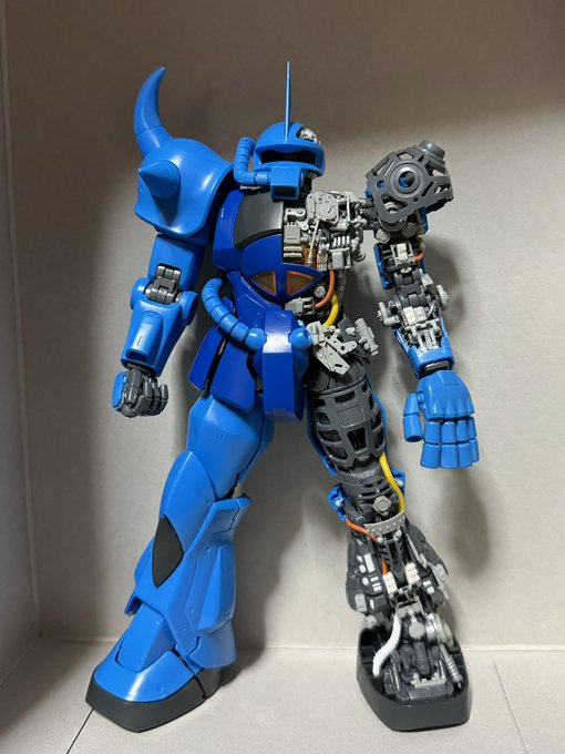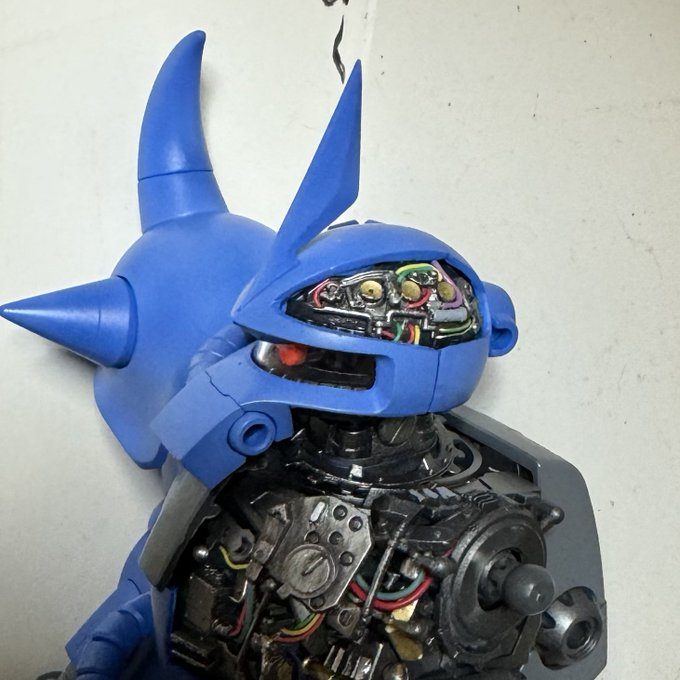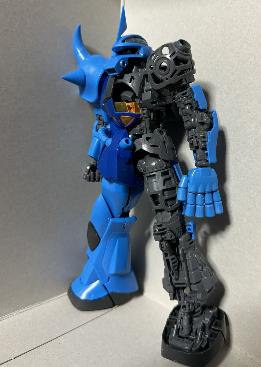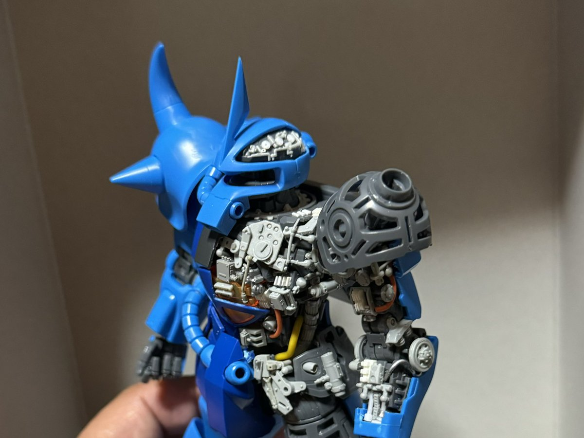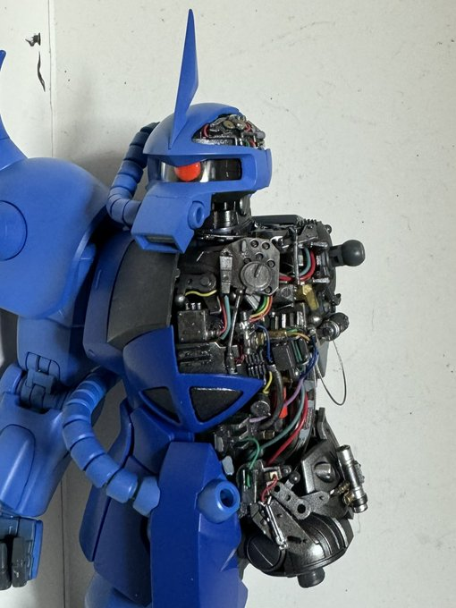 隨著外裝細節的完善,這架「半剖內部構造可見」MS-07B 古夫 終於完成!雖然市售的 MG 鋼普拉本身已經有一定的內部結構,但經過這次的改造後,機械感更加鮮明,細節更為豐富。由於內部結構大多是暗色系,ねこうさ特別選用亮藍色來塗裝外部裝甲,讓內外對比更加明顯。