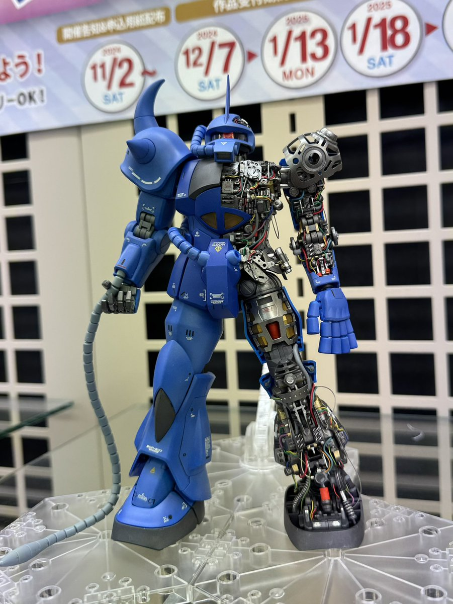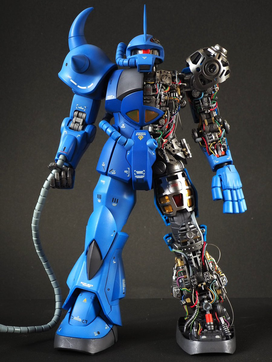 他以萬代推出的 「MG 1/100 MS-07B 古夫 Ver.2.0」鋼普拉為基礎,透過改造讓內部機械結構部分露出,營造出一種「半剖透明裝甲」的機械感。