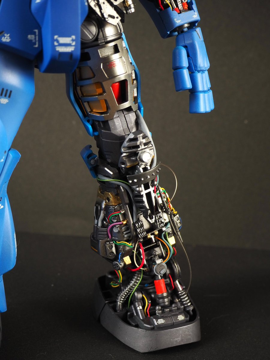 因為古夫的左手裝備有強力機關砲,所以這次的改造重點放在機體左半部,包括肩膀、腿部的外裝甲都經過特殊處理,讓內部結構清晰可見。